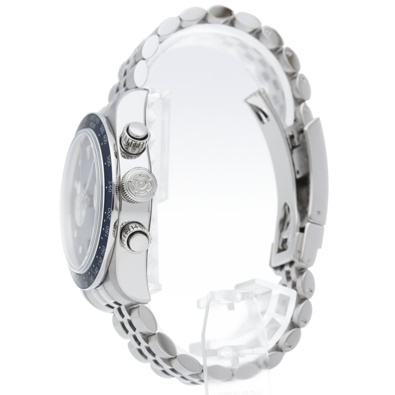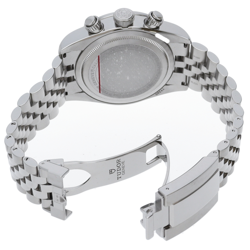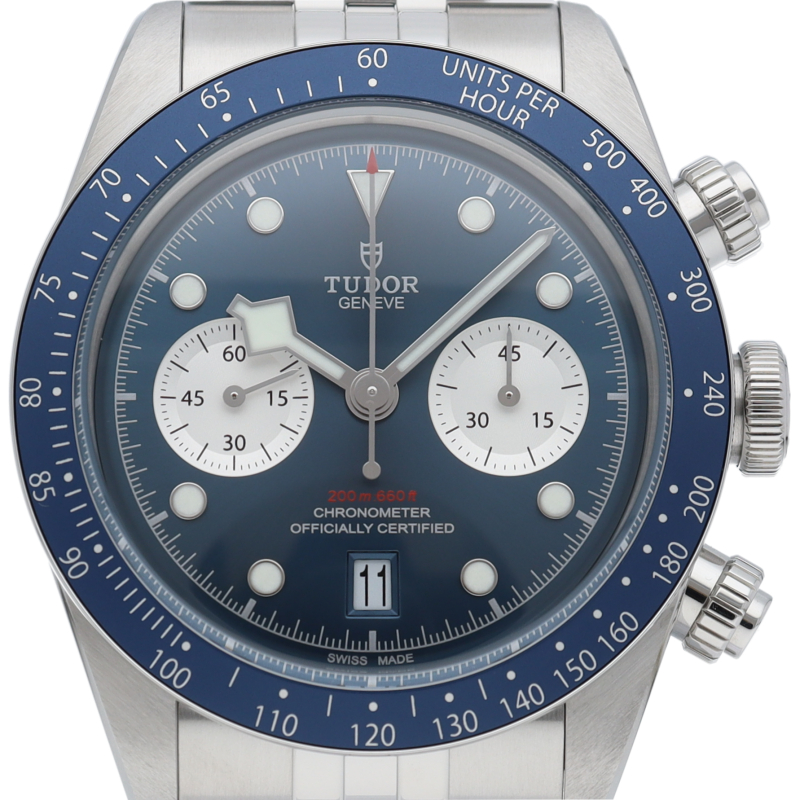 チューダーダイバーズウォッチのアイコンとなっている「スノーフレーク針」と初期のチューダークロノグラフから着想を得た、45分カウンターと6時位置のカレンダーはそのままに、鮮やかなブルーのダイヤルとベゼルを備えます。セルフアジャストが可能な“T-fit”クラスプを搭載し、簡単な操作で8mmの長さを5段階で調節可能になっており自分にぴったりなつけ心地に調整することができます。