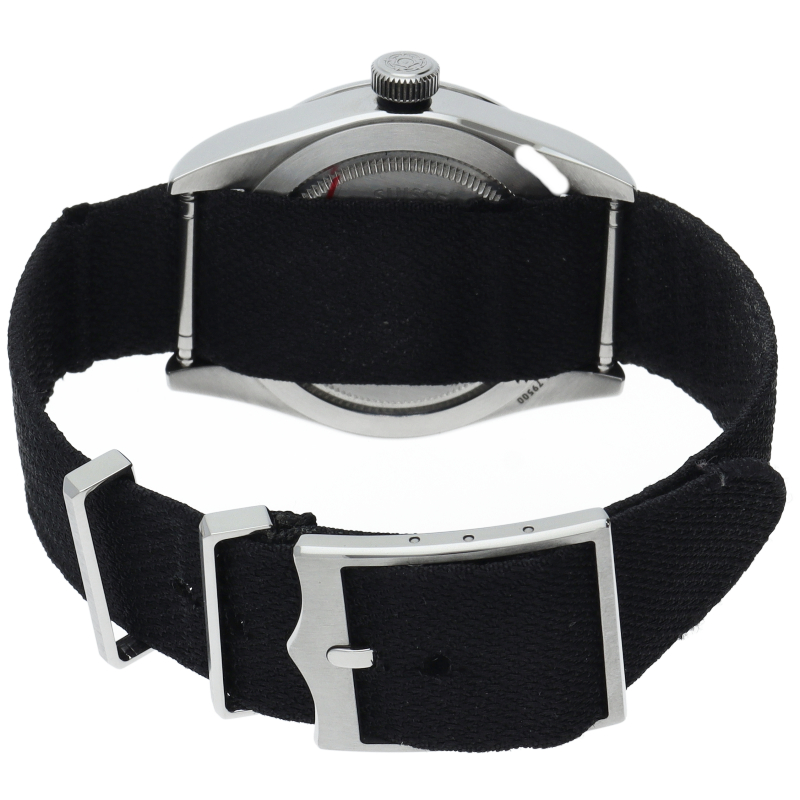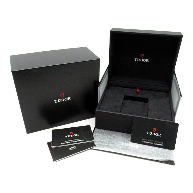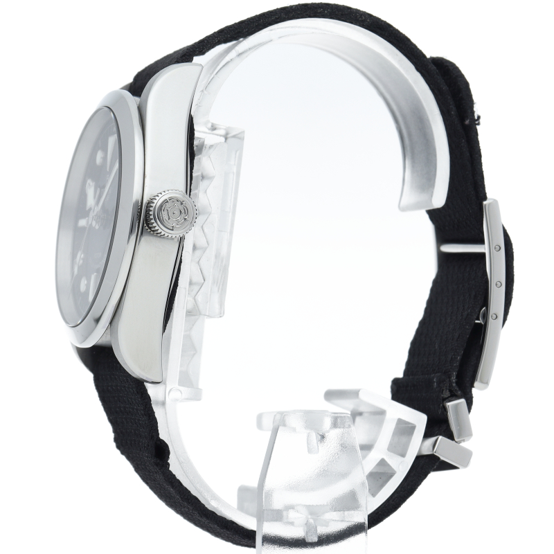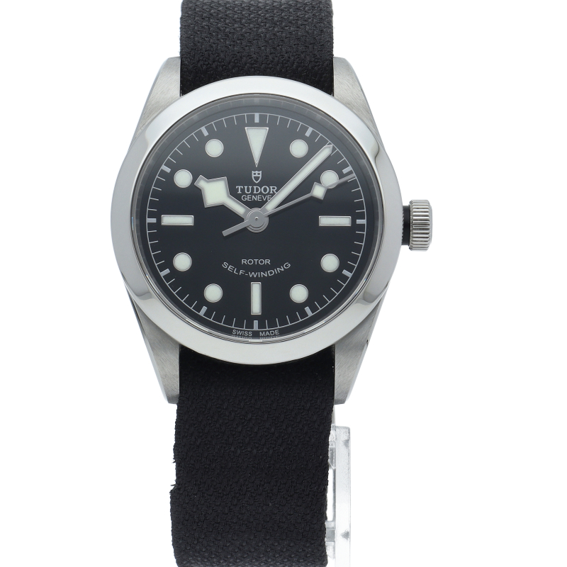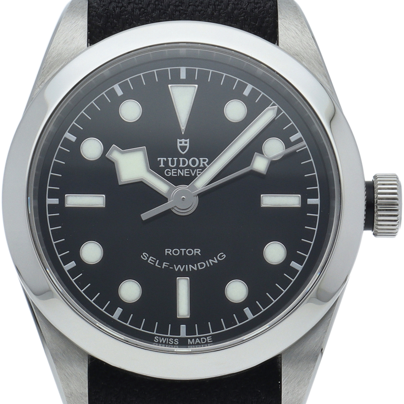チューダーの初期のサブマリーナに使用されていた通称“イカ針”を採用した「ブラックベイ」の36mmモデルです。ダイヤルには現行タイプの「盾」マークがプリントされていますが、リューズトップにはヴィンテージ感の漂う「バラ」マークを刻印。