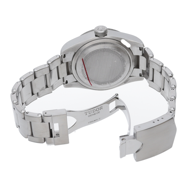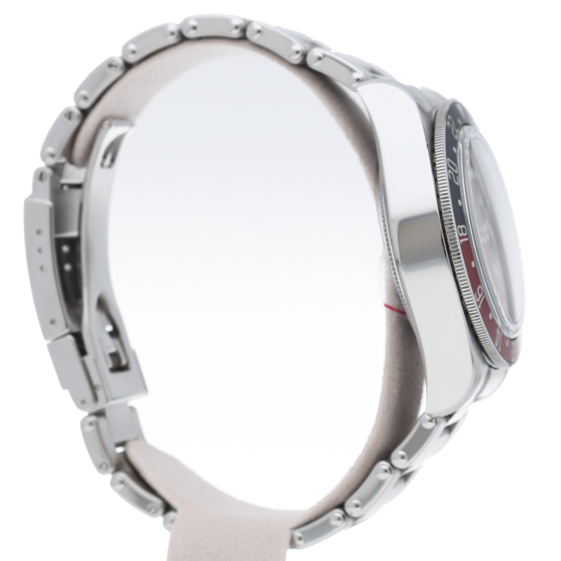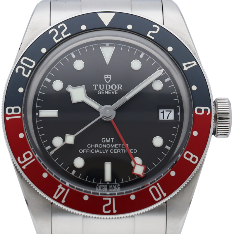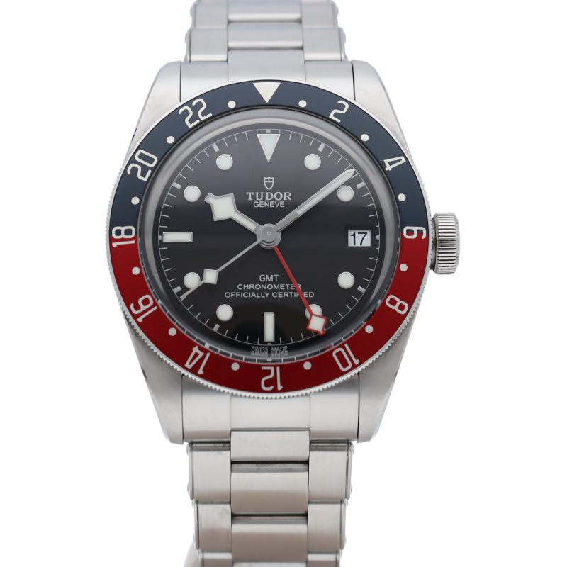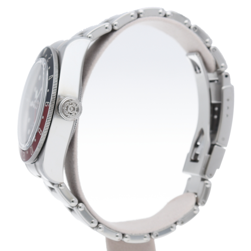 チュードルを代表するスポーツモデル「ブラックベイ」のGMT搭載モデル。ベゼルは昼夜がわかる様「ブルー/レッド」の2トーンの通称ペプシカラーとなっています。過去のダイバーズウォッチからインスピレーションを得た四角い針はGMT針にも付いています。自社製GMTムーブメント「MT5652」を搭載。70時間のパワーリザーブを誇り、クロノメーター認定を受けたムーブメントです。