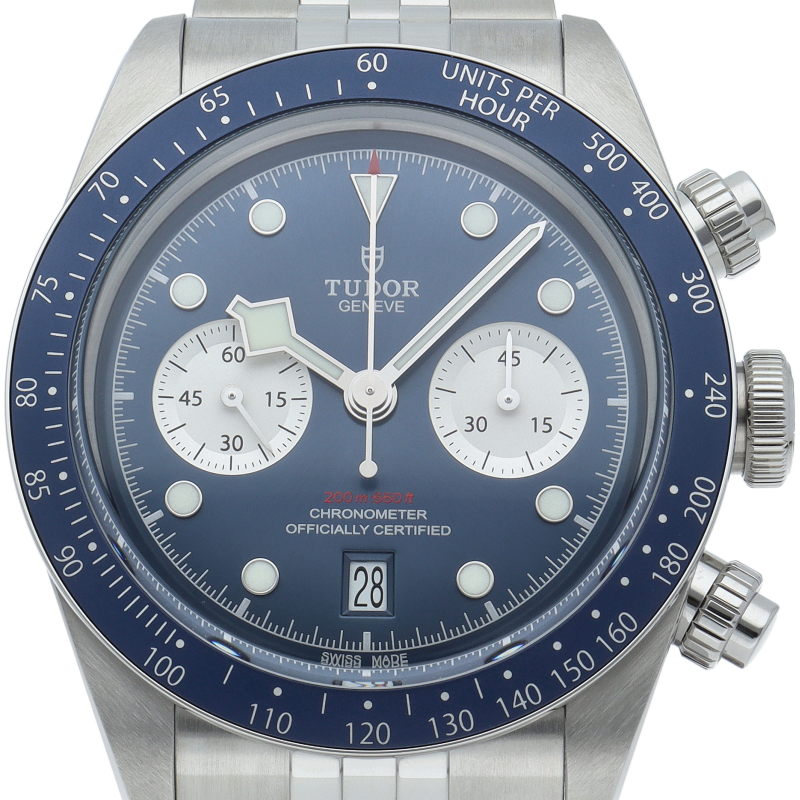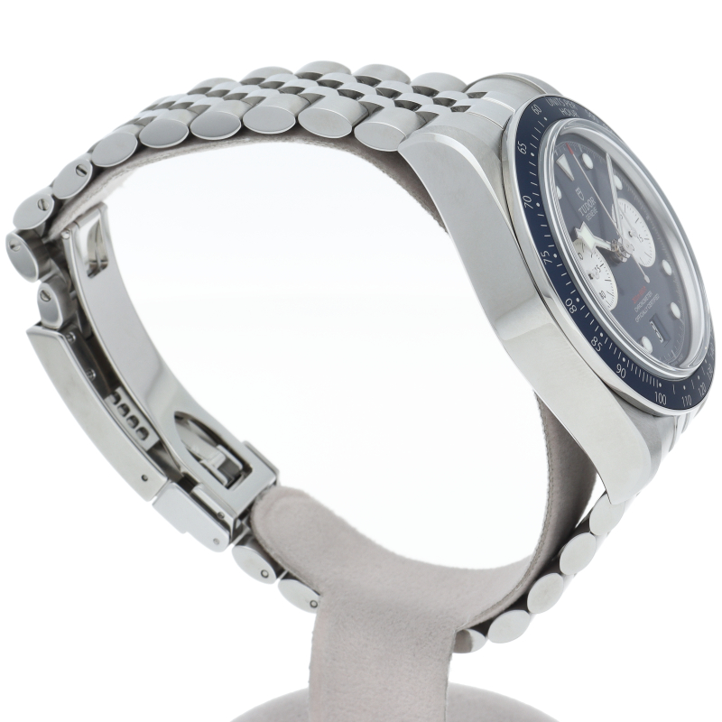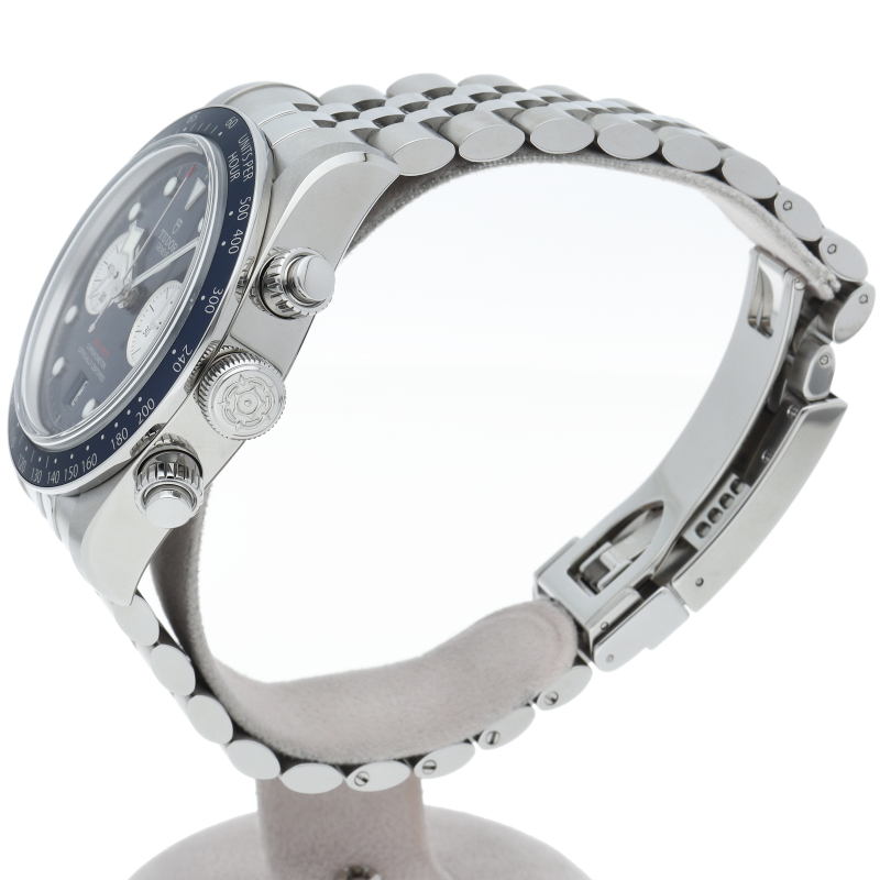 チューダーダイバーズウォッチのアイコンとなっている「スノーフレーク針」と初期のチューダークロノグラフから着想を得た、45分カウンターと6時位置のカレンダーはそのままに、鮮やかなブルーのダイヤルとベゼルを備えます。セルフアジャストが可能な“T-fit”クラスプを搭載し、簡単な操作で8mmの長さを5段階で調節可能になっており自分にぴったりなつけ心地に調整することができます。