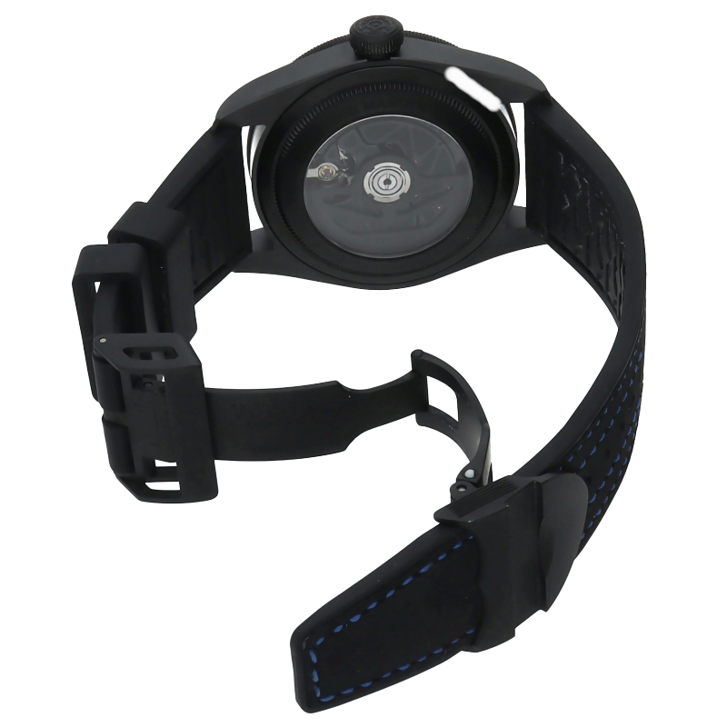 このモデルは、マットブラックのセラミック製ケースに鮮やかなブルーの文字盤とステッチが映えるデザインが特徴です。スイス連邦計量・認定局(METAS)によるマスター クロノメーター認定を受けた自社製ムーブメントを搭載しており、高い精度と技術革新を象徴する時計として知られています。