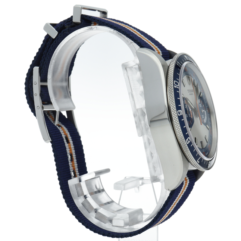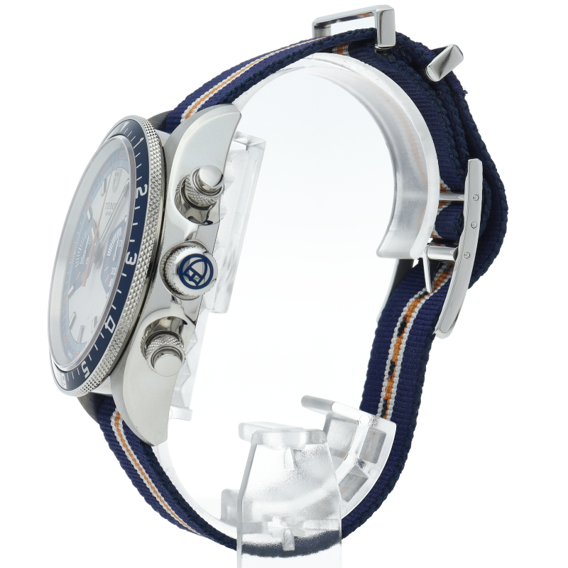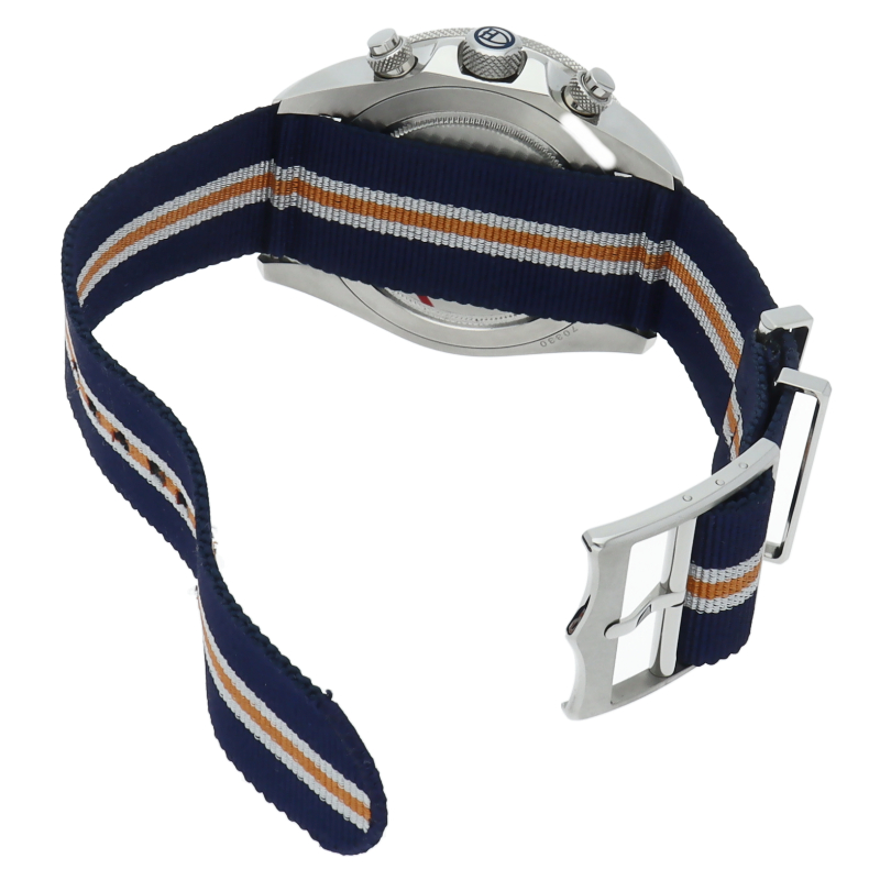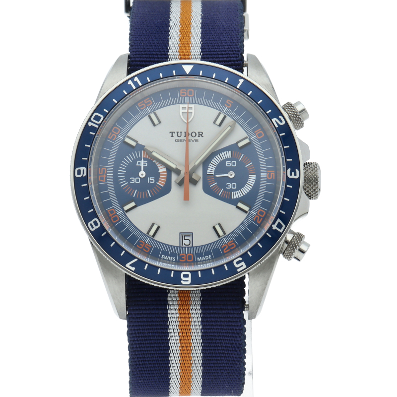 チュードルの人気のモンテカルロの復刻版です。青いベゼルとオレンジの針が独特なデザインです。クロノグラフ機能付きですので機能性も抜群。