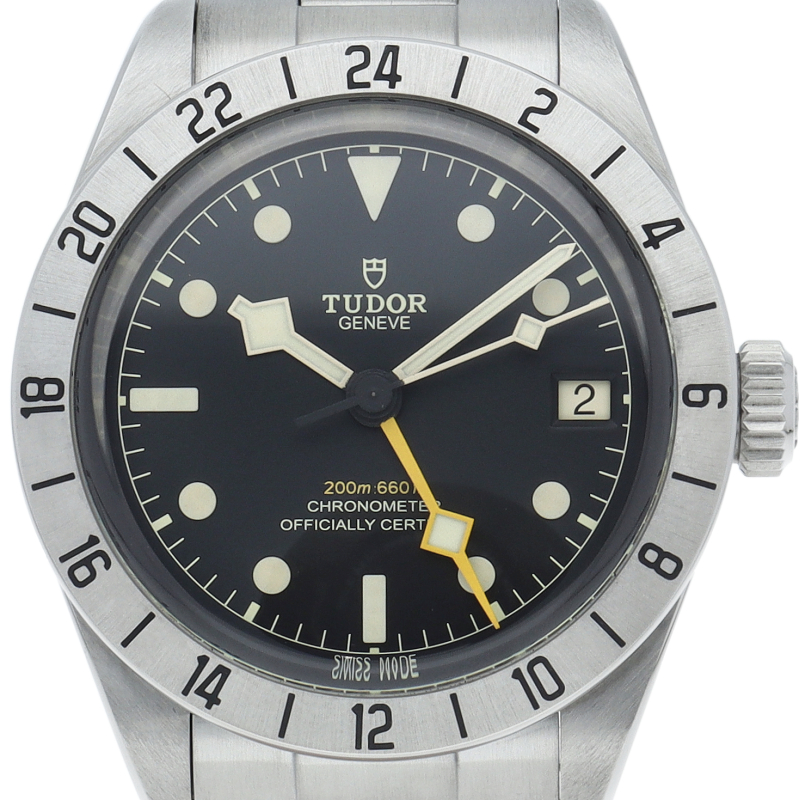 固定式のベゼルに刻印された24時間表示、大きめのイエローの24時間針等、ロレックスの初代エクスプローラー2を彷彿とさせるデザインで話題を呼んだブラックベイプロ。人気機種のフィフティーエイトと同じ39ミリケースを採用しており、日本人の手首周りにも馴染みやすいKサイズ感です。ムーブメントはクロノメーター認定を受け70時間のパワーリザーブを有する、両方向巻上げ式の自社製MT5652を搭載しています。