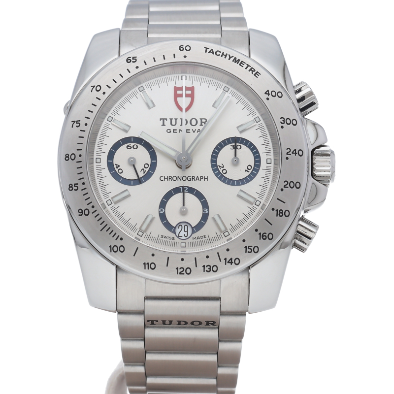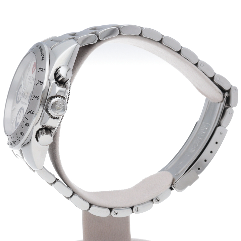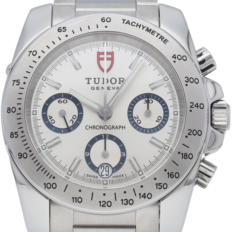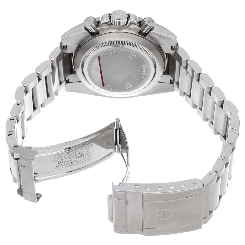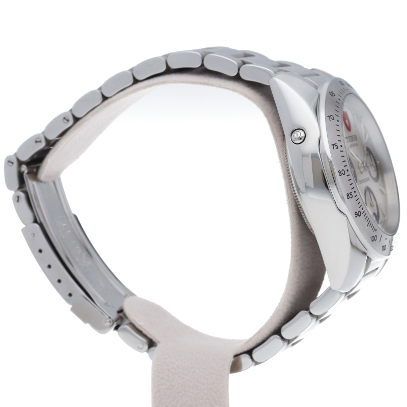2007年発表日本未発売のチューダーの新しいクロノグラフです。ダイヤルにCHRONOの文字があり、『盾』のロゴはダイヤルだけでなく、リューズや裏ぶたにも刻印されています。
