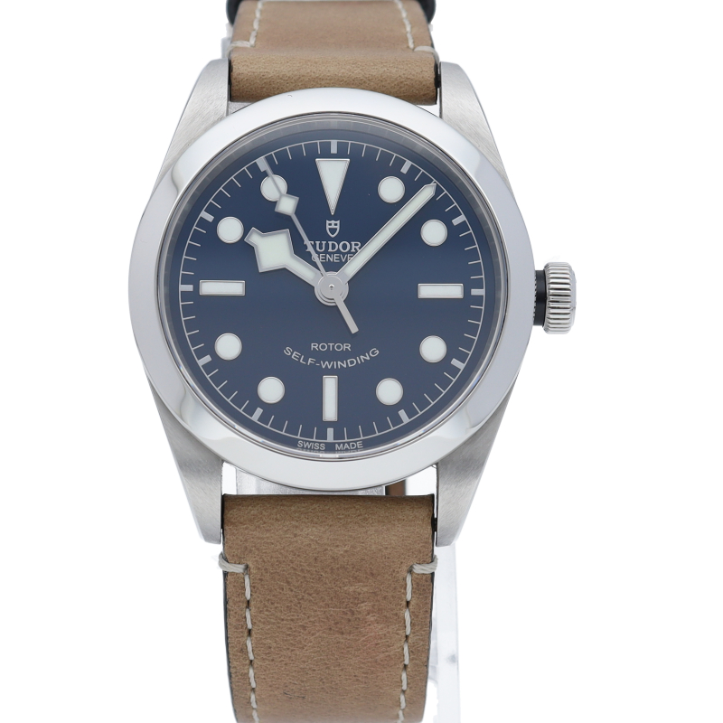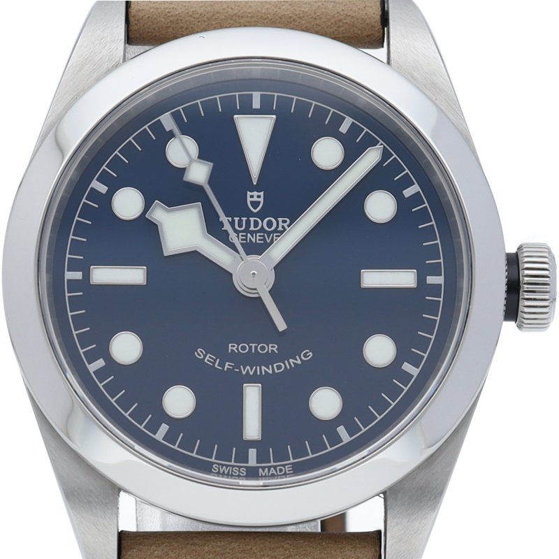 チューダーの初期のサブマリーナに使用されていた通称“イカ針”を採用した「ブラックベイ」の36mmモデルです。ダイヤルには現行タイプの「盾」マークがプリントされていますが、リューズトップにはヴィンテージ感の漂う「バラ」マークを刻印。