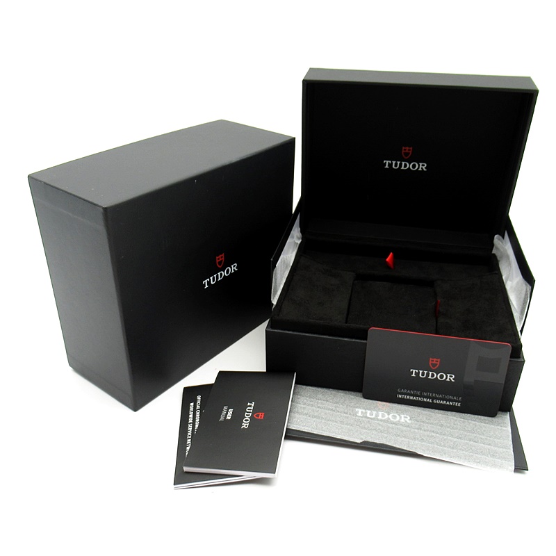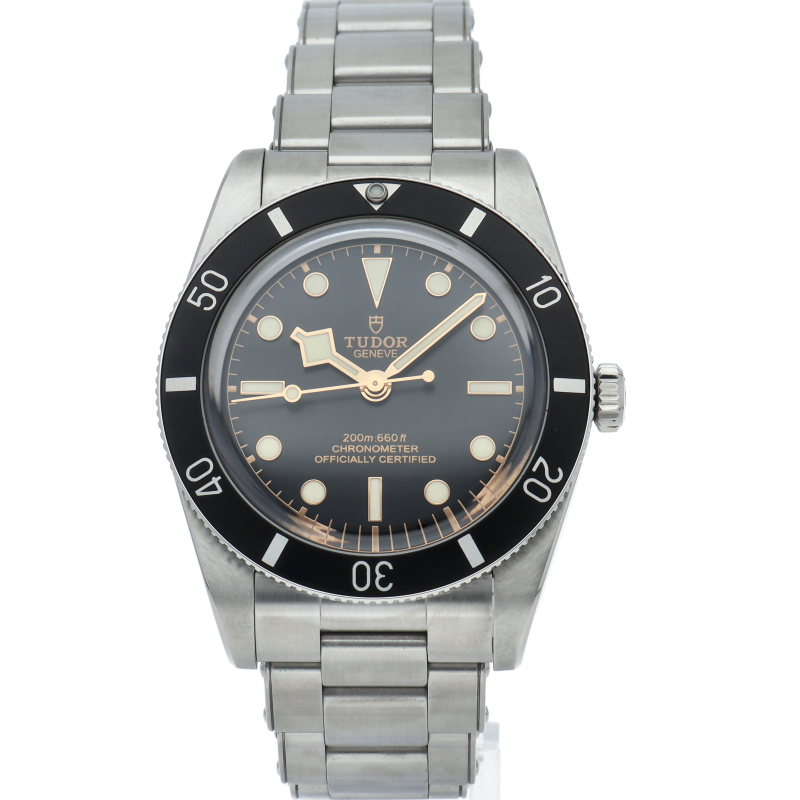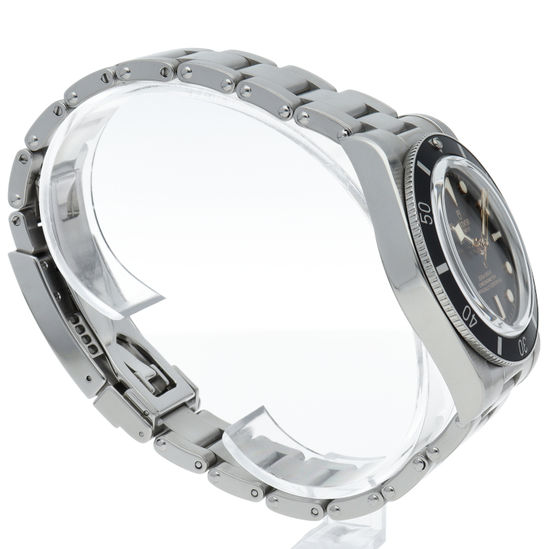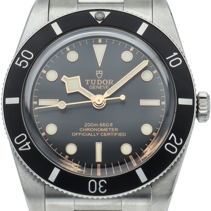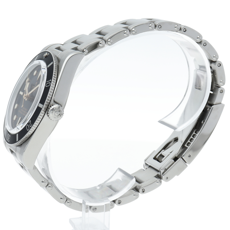 チューダーの初期のサブマリーナに使用されていた通称“イカ針”を採用した「ブラックベイ」。こちらはステンレスタイプで、ケース径37mmモデル。1960年代までのロレックスやチューダーに使われていたリベットブレス仕様のダイバーウォッチです。