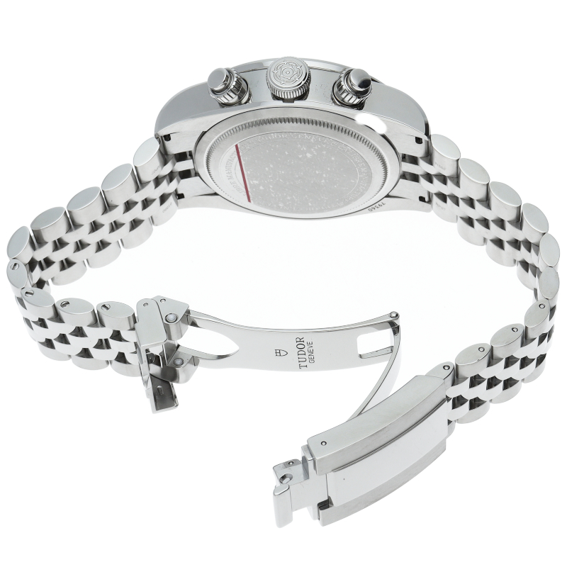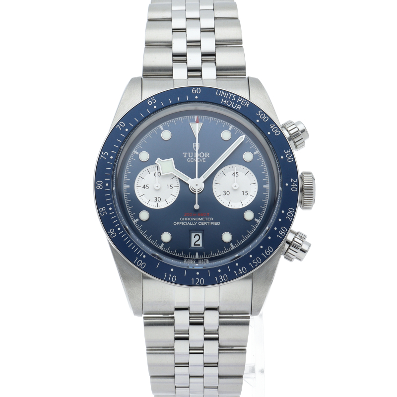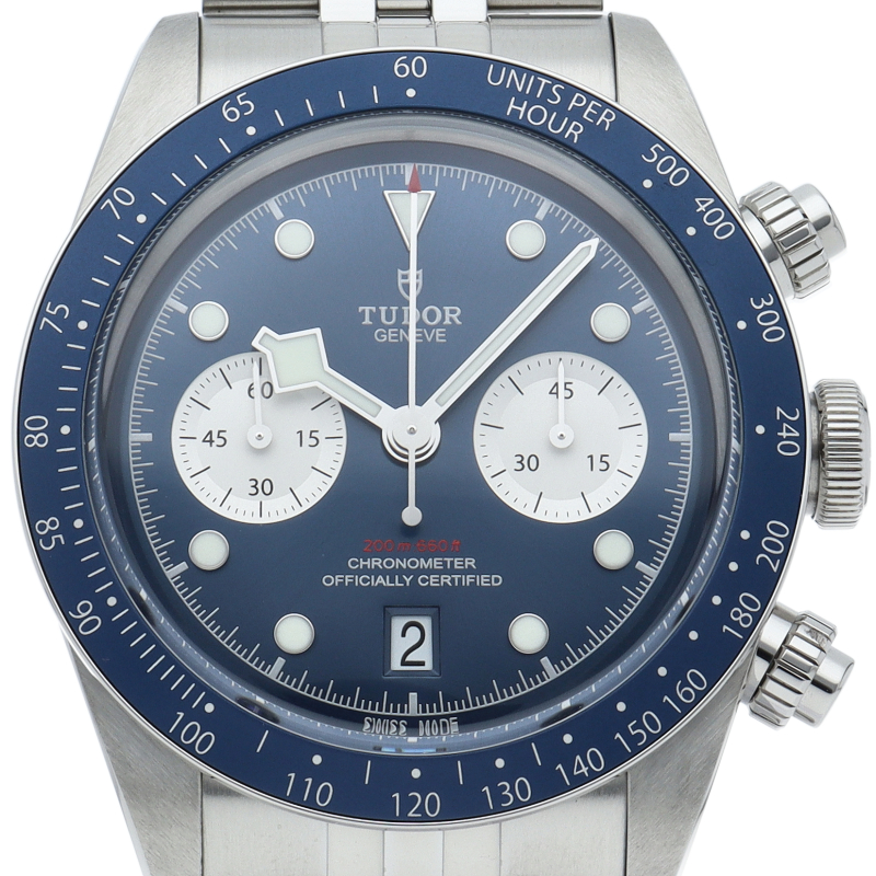 チューダーダイバーズウォッチのアイコンとなっている「スノーフレーク針」と初期のチューダー クロノグラフから着想を得た、45分カウンターと6時位置のカレンダーはそのままに、鮮やかなブルーのダイヤルとベゼルを備えます。セルフアジャストが可能な“T-fit”クラスプを搭載し、簡単な操作で8mmの長さを5段階で調節可能になっており自分にぴったりなつけ心地に調整することができます。