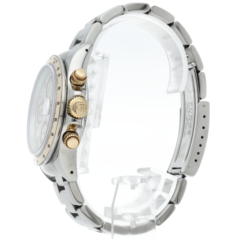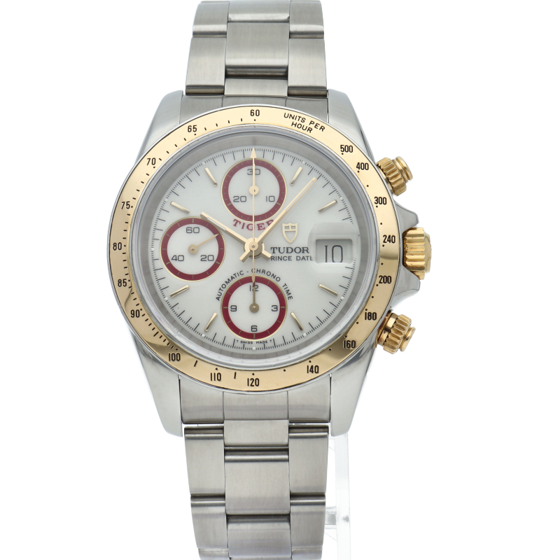 TUDORクロノタイムタイガーモデルです。ダイヤルがややアイボリーがかったホワイトにインダイヤルのサークルのボルドー色が映えカッコイイ文字盤です。Dバックルは純正が装着されています。クロノタイムの中でもでこのコンビタイプ比較的に数がが少ない時計で革ベルトの相性も良くアダルトな雰囲気のホワイトタイガーです。