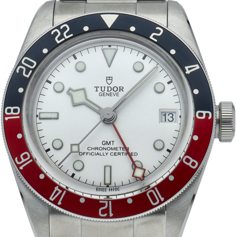 チュードルを代表するスポーツモデル「ブラックベイ」のGMT搭載モデル。ベゼルは昼夜がわかる様「ブルー/レッド」の2トーンの通称ペプシカラーとなっています。過去のダイバーズウォッチからインスピレーションを得た四角い針はGMT針にも付いています。自社製GMTムーブメント「MT5652」を搭載。70時間のパワーリザーブを誇り、クロノメーター認定を受けたムーブメントです。