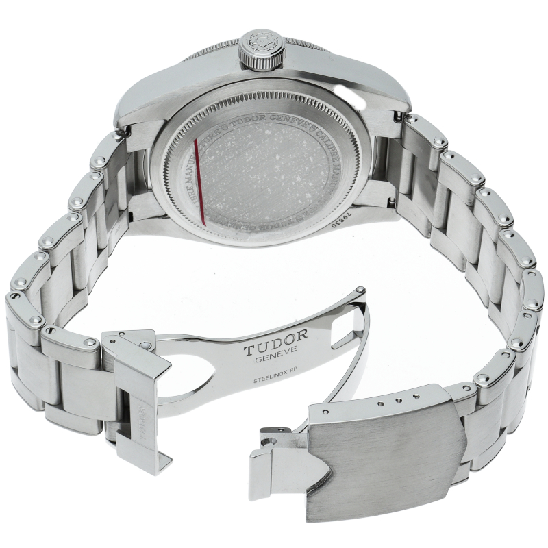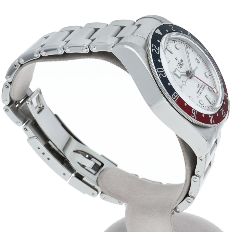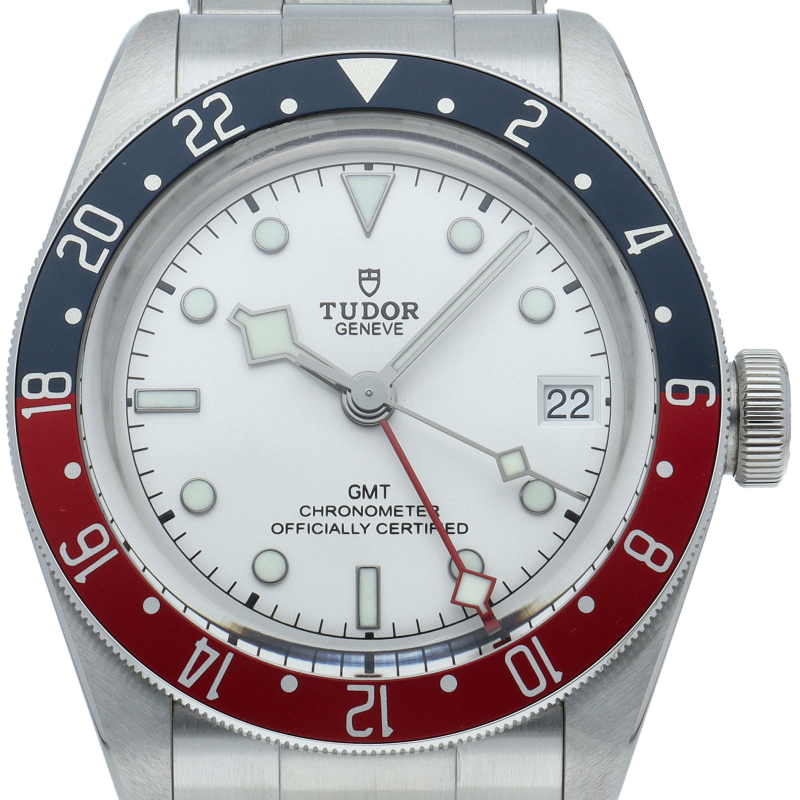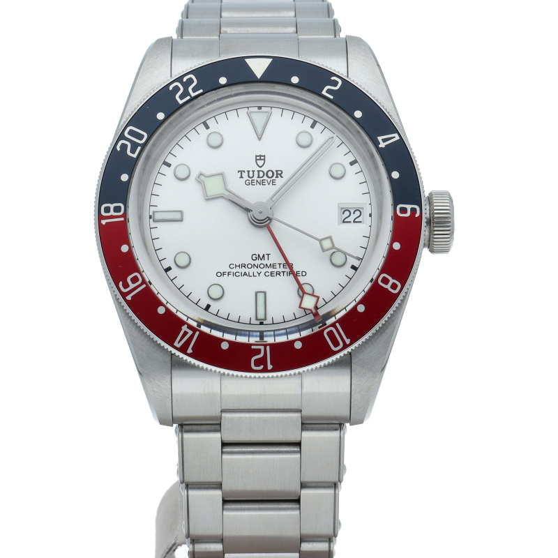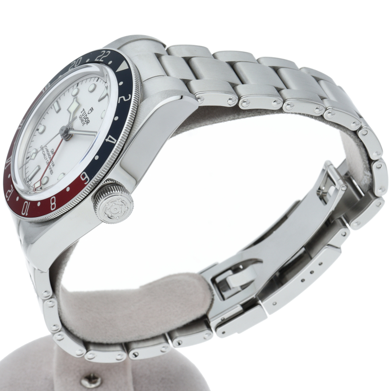 チュードルを代表するスポーツモデル「ブラックベイ」のGMT搭載モデル。ベゼルは昼夜がわかる様「ブルー/レッド」の2トーンの通称ペプシカラーとなっています。過去のダイバーズウォッチからインスピレーションを得た四角い針はGMT針にも付いています。自社製GMTムーブメント「MT5652」を搭載。70時間のパワーリザーブを誇り、クロノメーター認定を受けたムーブメントです。