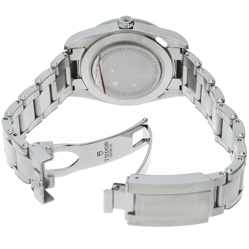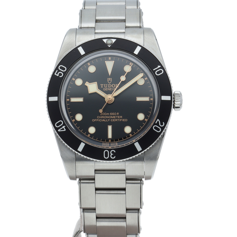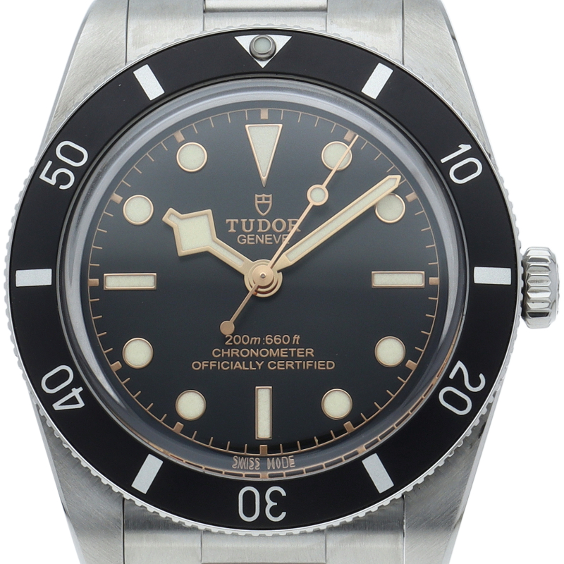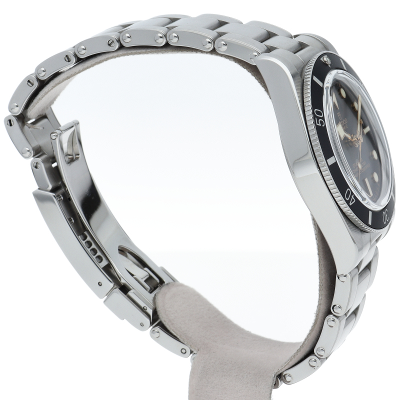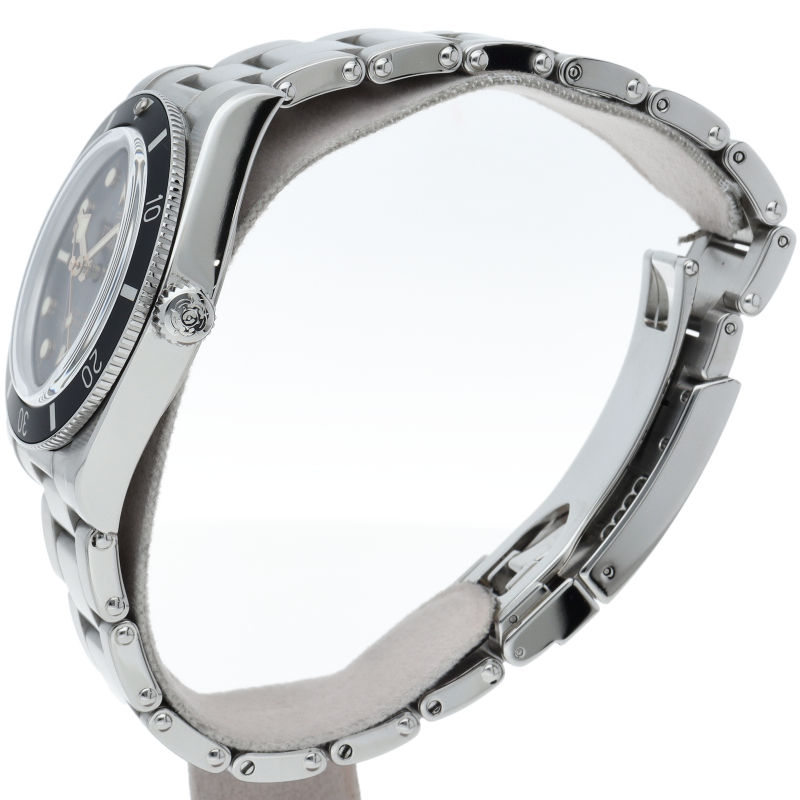 チューダーの初期のサブマリーナに使用されていた通称“イカ針”を採用した「ブラックベイ」。こちらはステンレスタイプで、ケース径37mmモデル。1960年代までのロレックスやチューダーに使われていたリベットブレス仕様のダイバーウォッチです。
