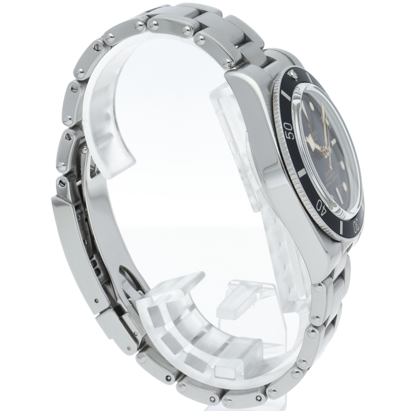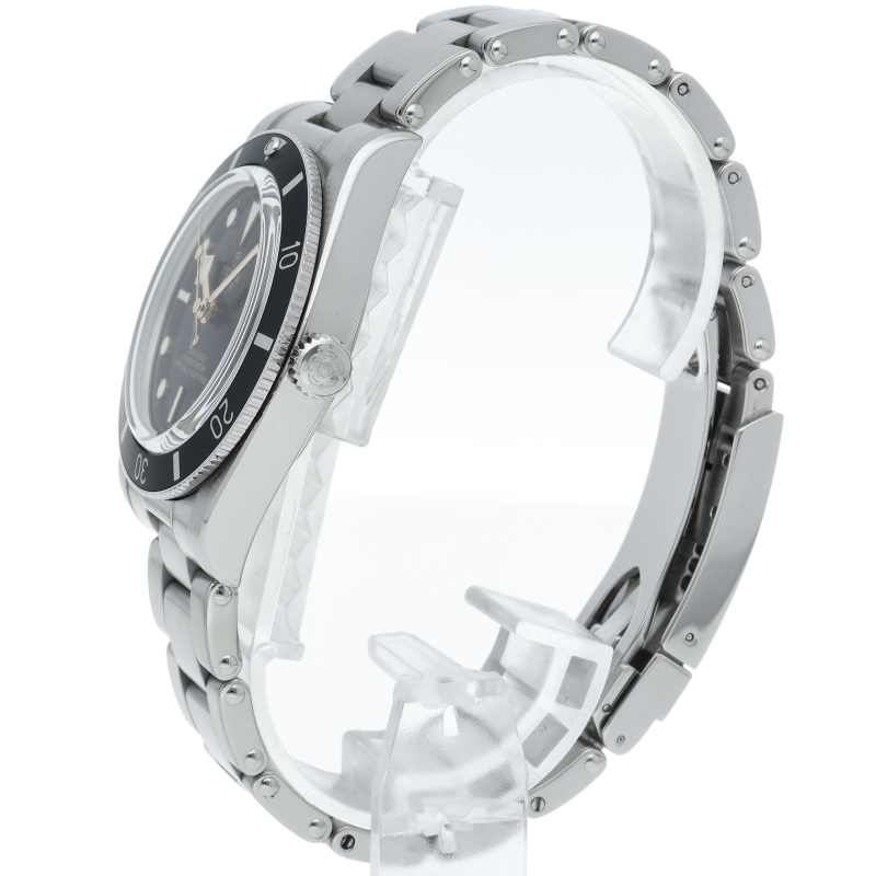 チューダーの初期のサブマリーナに使用されていた通称“イカ針”を採用した「ブラックベイ」。こちらはステンレスタイプで、ケース径37mmモデル。1960年代までのロレックスやチューダーに使われていたリベットブレス仕様のダイバーウォッチです。