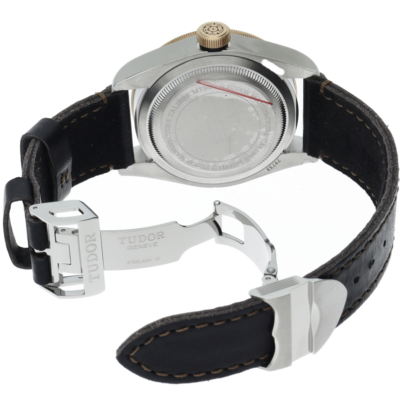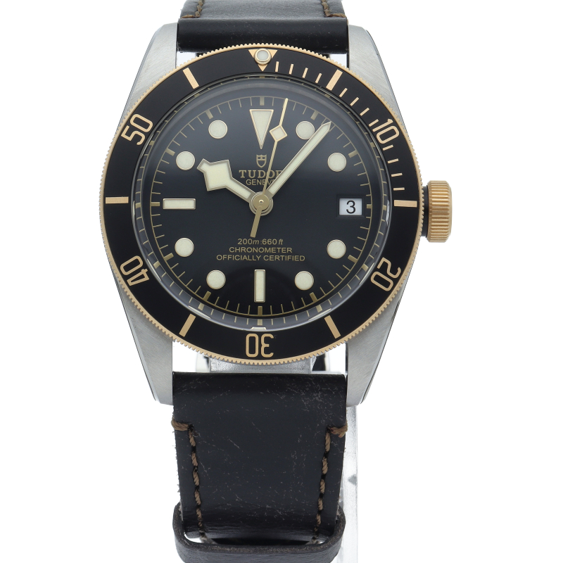 チューダーの初期のサブマリーナに使用されていた通称“イカ針”を採用した「ブラックベイ」。こちらはヴィンテージ加工が施されたカーフストラップ&ホールディングバックルタイプです。また、文字盤には現行タイプの「盾」マークをプリントしていますがリューズトップにはヴィンテージ感の漂う「バラ」マークが刻印されています。