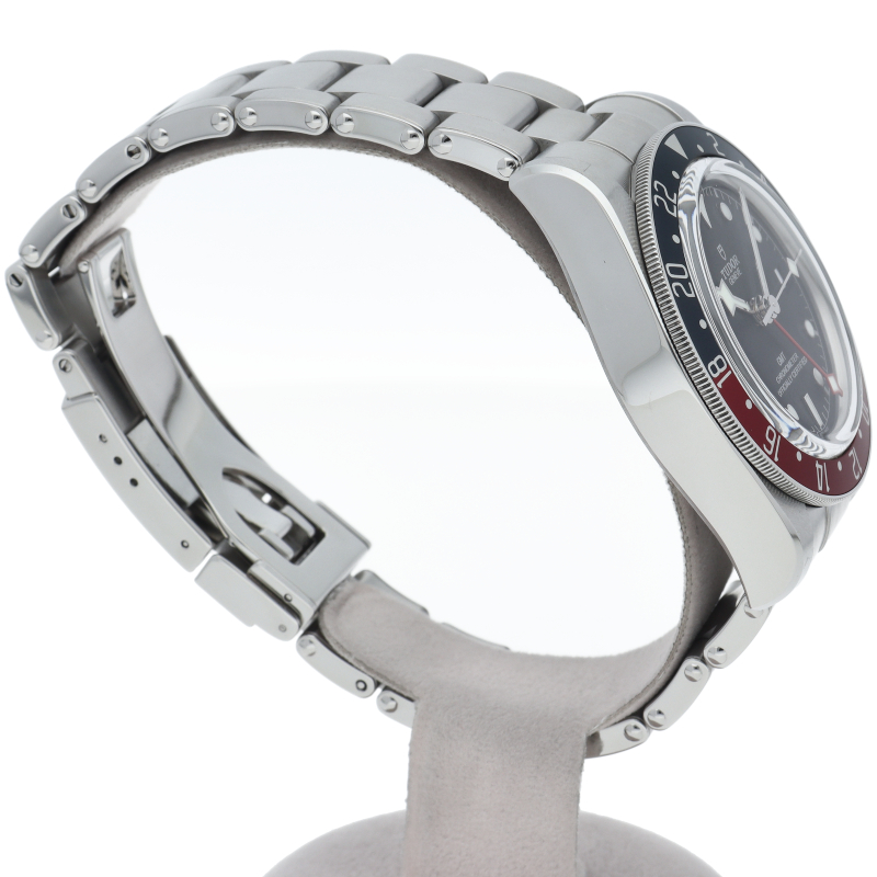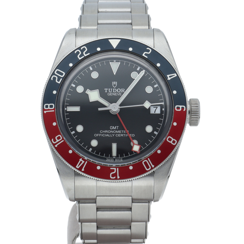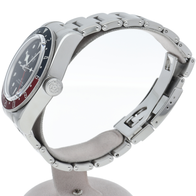 チュードルを代表するスポーツモデル「ブラックベイ」のGMT搭載モデル。ベゼルは昼夜がわかる様「ブルー/レッド」の2トーンの通称ペプシカラーとなっています。過去のダイバーズウォッチからインスピレーションを得た四角い針はGMT針にも付いています。自社製GMTムーブメント「MT5652」を搭載。70時間のパワーリザーブを誇り、クロノメーター認定を受けたムーブメントです。