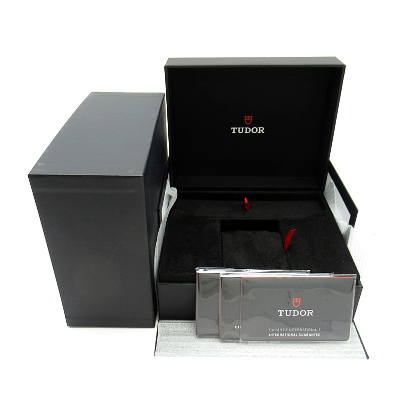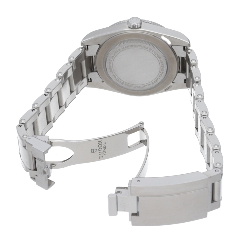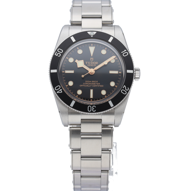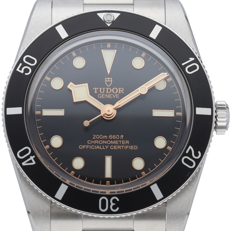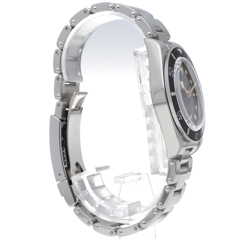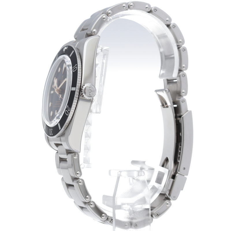 チューダーの初期のサブマリーナに使用されていた通称“イカ針”を採用した「ブラックベイ」。こちらはステンレスタイプで、ケース径37mmモデル。1960年代までのロレックスやチューダーに使われていたリベットブレス仕様のダイバーウォッチです。