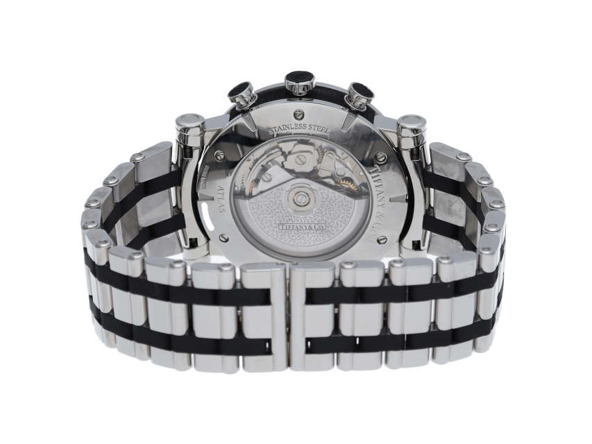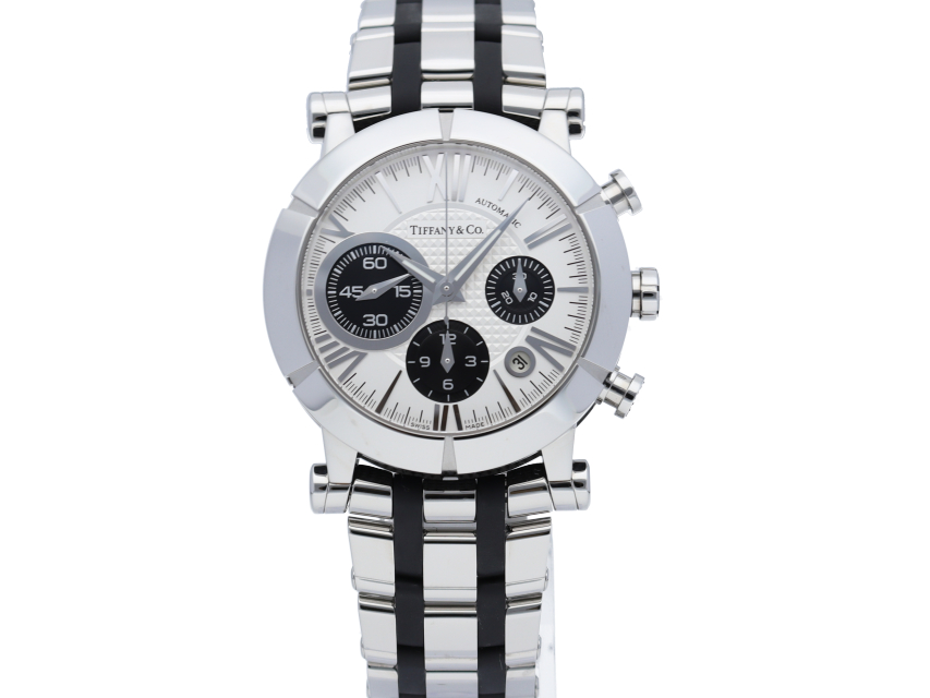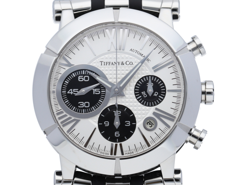 ニューヨーク本店の正面玄関に飾られた時計、アトラスクロックがモデルの由来になっている「アトラスウォッチ」。立体的なローマンインデックスがアトラスの特徴です。こちらは文字盤中央に「クル・ド・パリ」の仕上げが施されたクロノグラフモデル。
