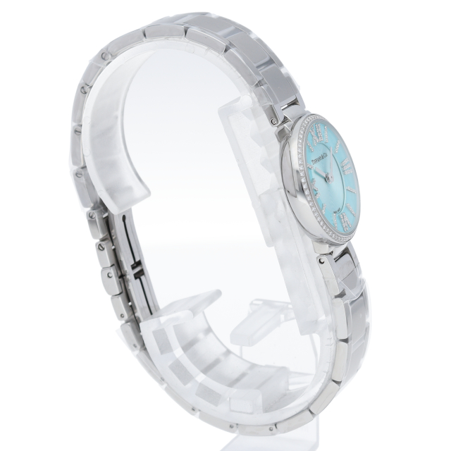 ティファニーブルーの文字盤にローマ数字がインデックスにデザインされているティファニーらしい逸品です。クラシカルな印象ながらも、一目でティファニーと解る、その普遍的なデザインが魅力的です。