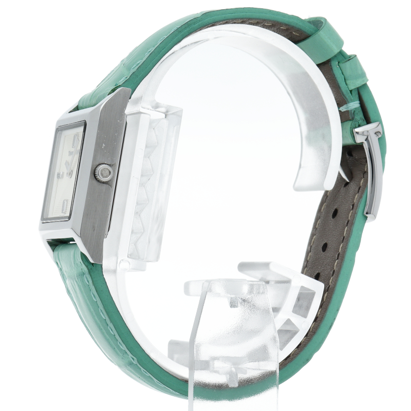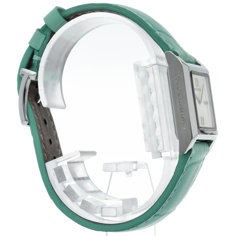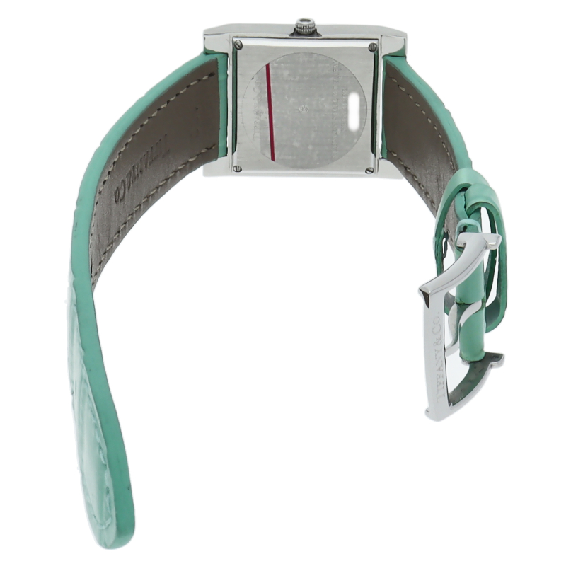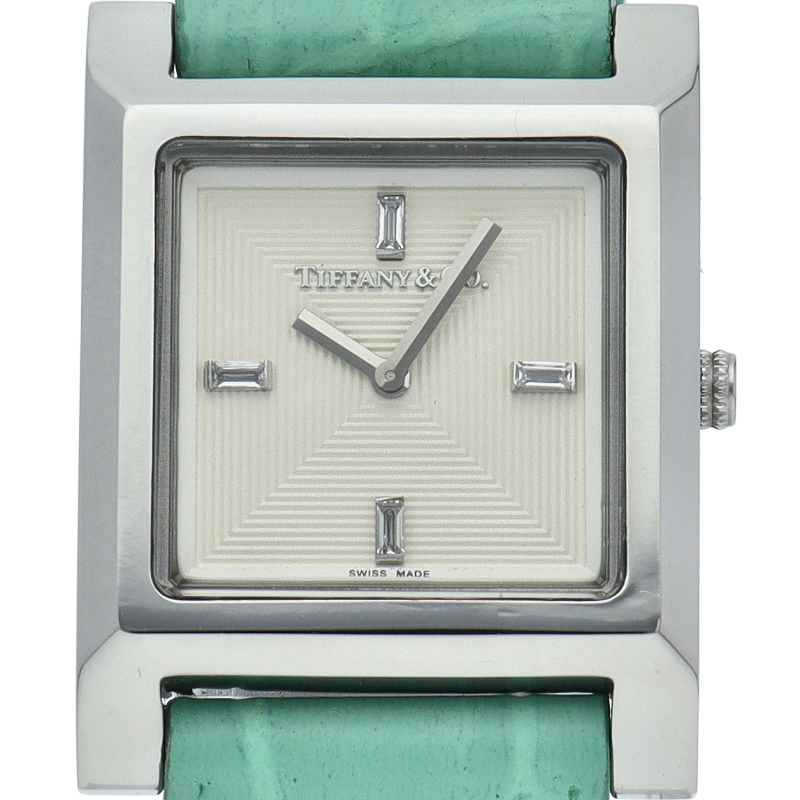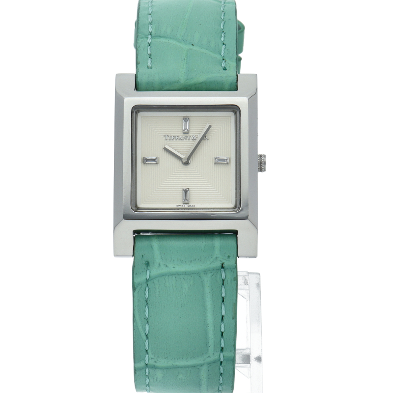 シルバーカラーのダイヤルにバゲットカットダイヤモンドがあしらわれたインデックスが優美な印象の、22mm メイカーズウォッチ。ティファニーブルーのアリゲーターストラップが一際存在感をアップさせる、エレガントな逸品です。