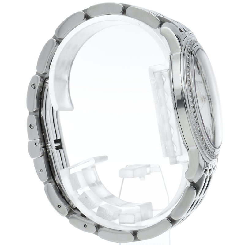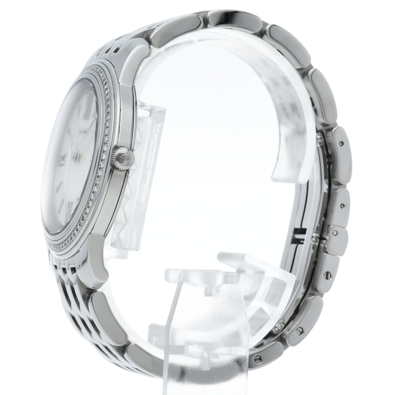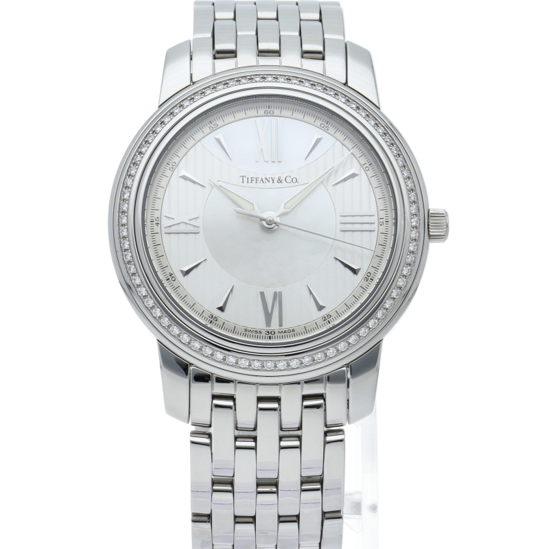 宝飾ブランドの一つであるティファニーのマークシリーズです。 懐中時計より着想を得たモデルでシンプルで落ち着いた印象になります。 ベゼルにダイヤを施し、文字盤中央にはホワイトシェルを使用しております。