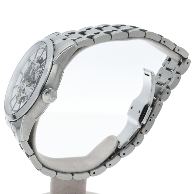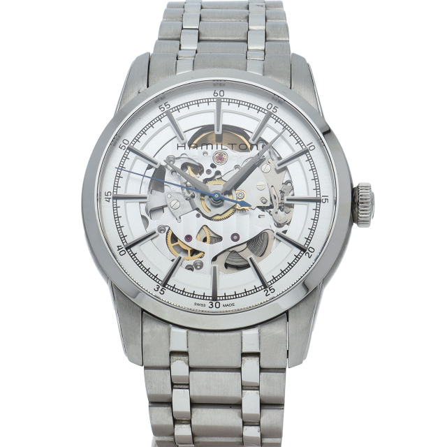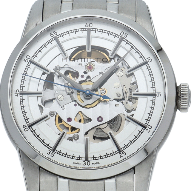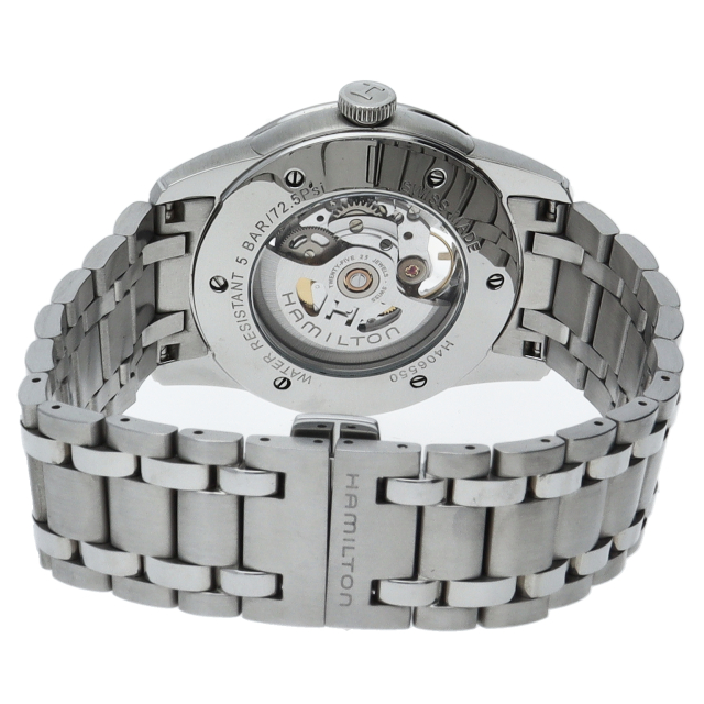 ハミルトンの輝かしい歴史を称えるデザイン。H-10-Sムーブメントは、驚異的な80時間標準持続時間を備え、クラシックなデザインに機能と力強さを与えています。スケルトン仕様でムーブメントの動きを存分に堪能することができます。H406550(H40655151)