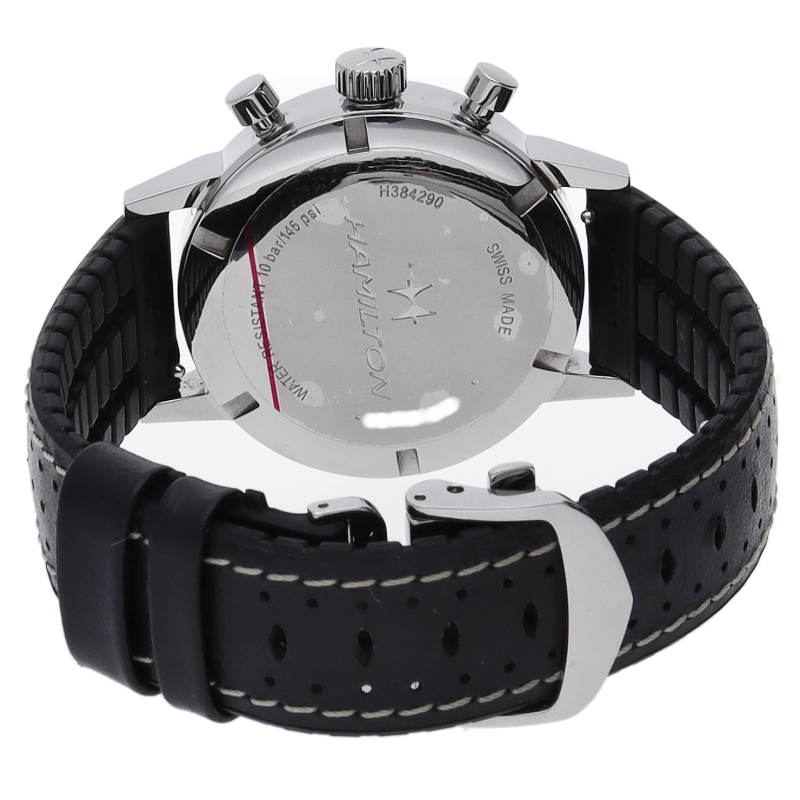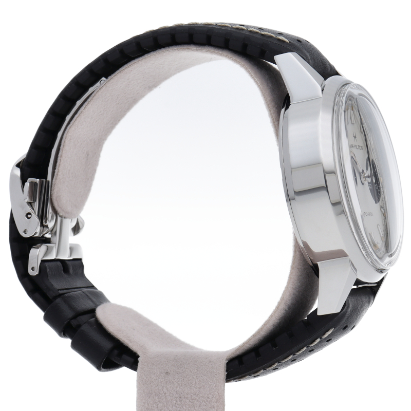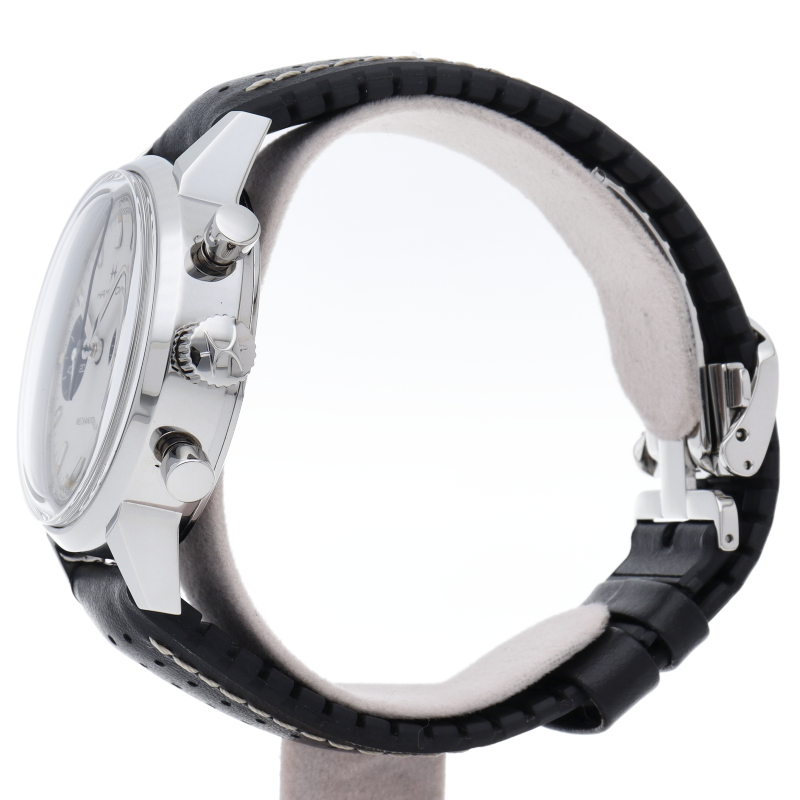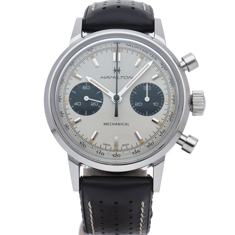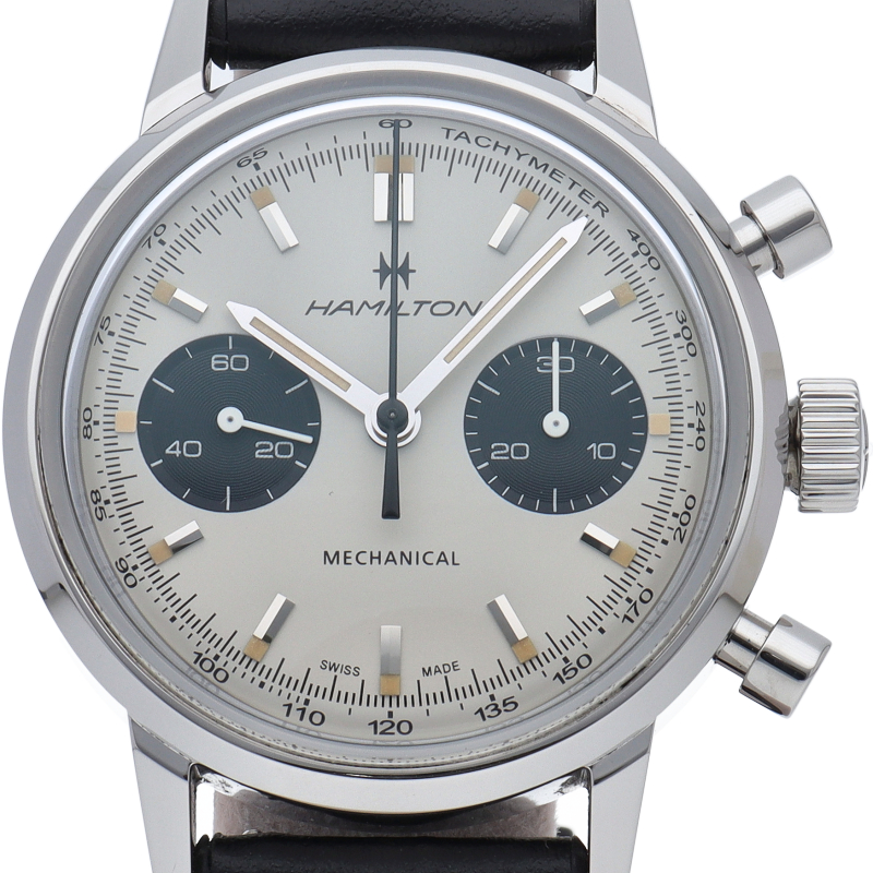 「イントラマティック クロノグラフ H」をその手で巻き上げる歓び。ハミルトンの新しい、手巻き式クロノグラフムーブメント「H-51キャリバー」を搭載したこのモデルは、心に触れるタイムピースです。両面反射防止加工を施したボックス型のサファイアクリスタルから覗くアイコニックな“パンダダイヤル”が豊かなヘリテージを湛えます。