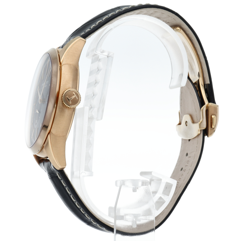 8時位置に配置した大きめなスモールセコンドが印象的な「アメリカン クラシック レイルロード スモールセコンド」。文字盤のくさび型インデックスの外周に沿ってレイルロード分目盛がプリントされ、とても視認性の高いデザインですのでON/OFF問わず使い勝手は良好です。裏蓋はシースルーバック仕様となっており、ハミルトンの「H」が型抜きされたローターやテンプの動きがお楽しみいただけます。H406550/H40545731。