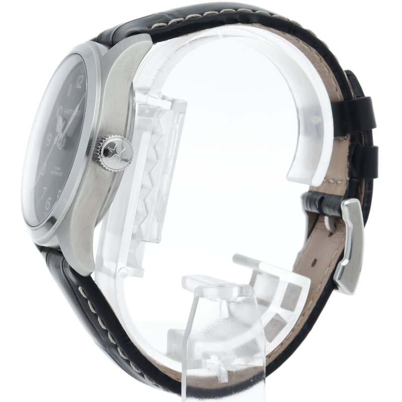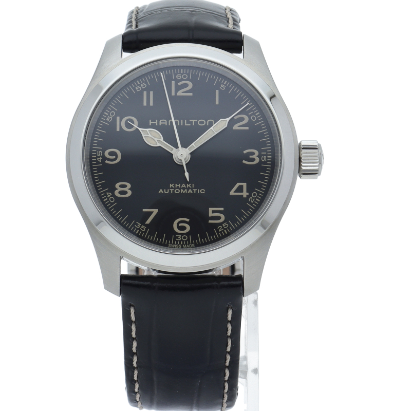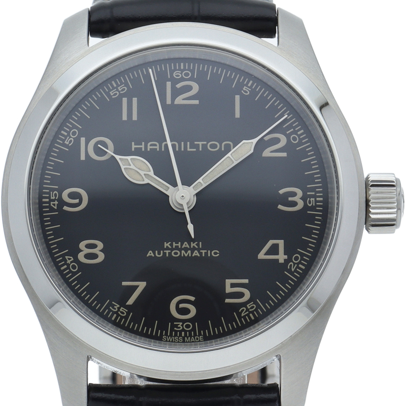 「カーキ フィールド マーフ オート」がケース径38mmで登場。高い視認性のブラックダイヤル、スーパールミノバR加工を施したヴィンテージ スタイルのベージュの針、ブラックレザーストラップを備えオリジナルである42mmモデルの主要な美的コードを継承しています。