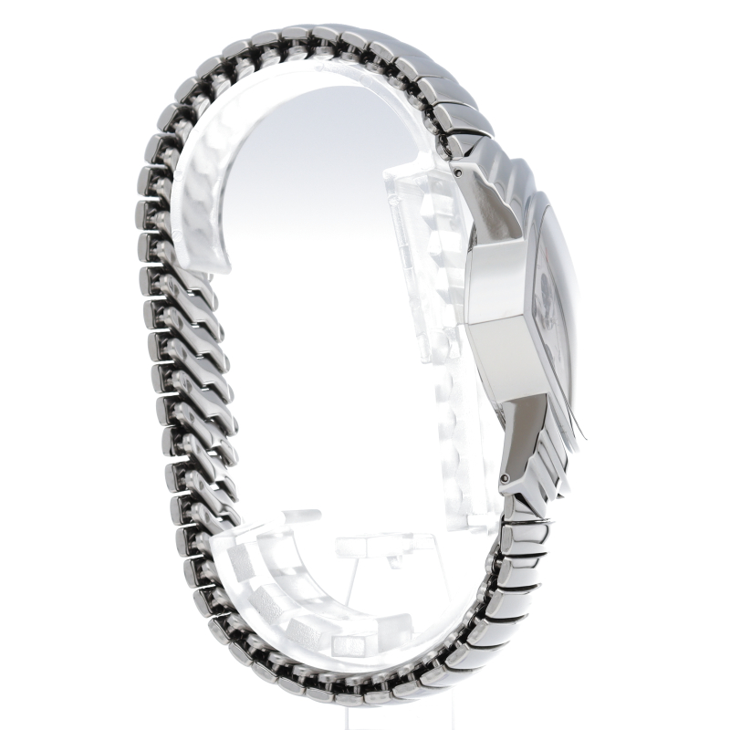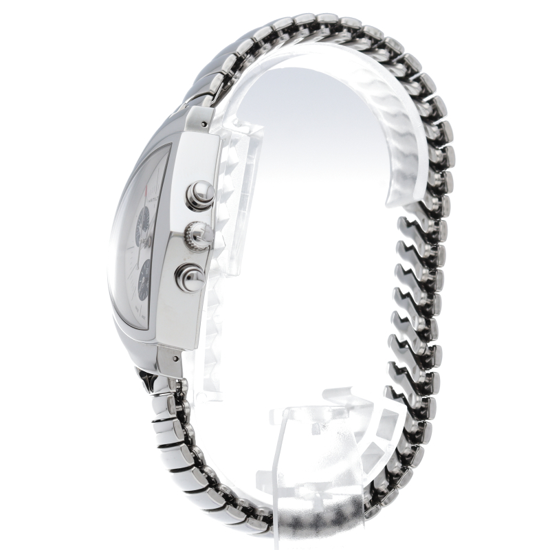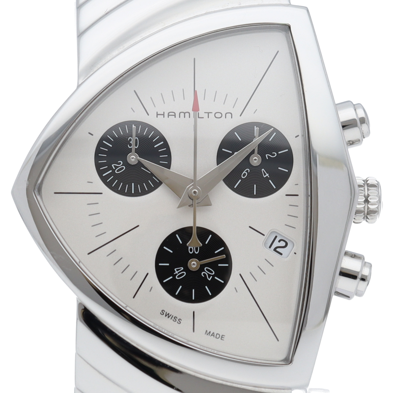 1957年に発売されたベンチュラは、世界初の電池式腕時計として時計史に革命を起こしました。革新的で大胆なデザインを備えたベンチュラはアイコンウォッチとして不動の人気を誇り、コレクターズアイテムとなりました。ベンチュラの最新モデルは、オリジナルに忠実な盾形のフォルムをそのままに、スポーティなクロノグラフモデルをモダンなデザインへと昇華させました。H244320/H24432151