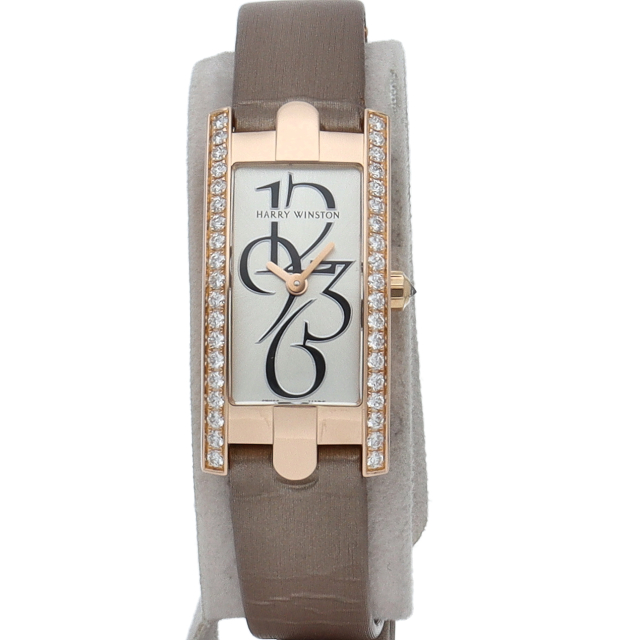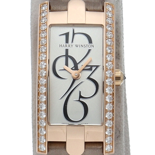 宝飾業界で世界的に有名な「ハリー ウィンストン」。芸術的なデザインと高級感溢れる人気のモデルで、ベゼルとダイヤルに施されたダイヤベゼルとピンクゴールドの組み合わせが上品な1本。