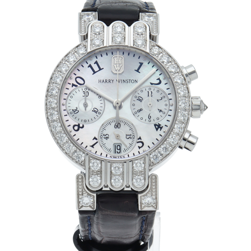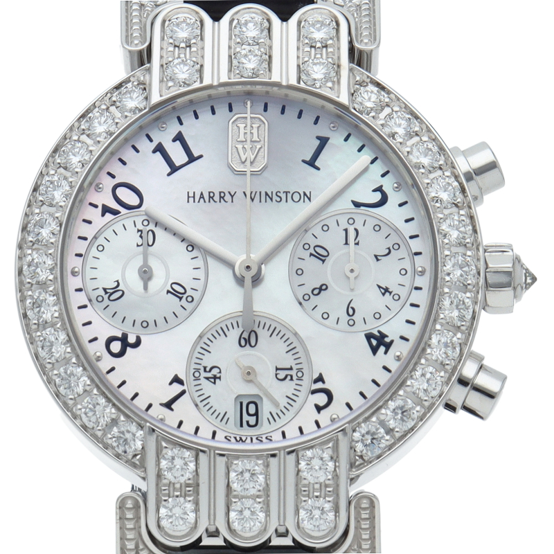 ロータス(ハスの葉)をモチーフにした文字盤が特徴の“プルミエール”。こちらはベゼルにダイヤがセッティングされたゴージャスなモデルです。ケース径32mmと程良いサイズでダイアルに光沢のあるホワイトシェルが使われています。少し大きめな時計をお探しの女性にもお勧めです。