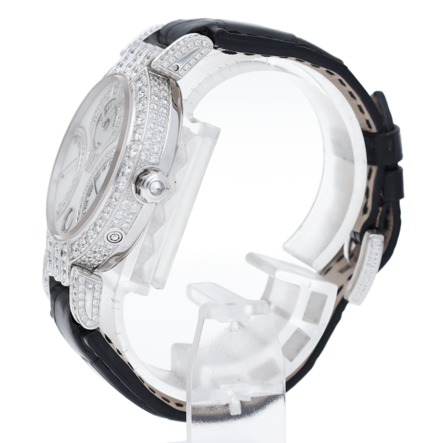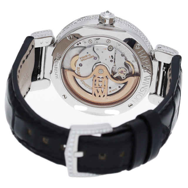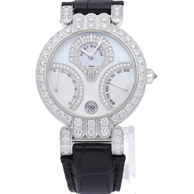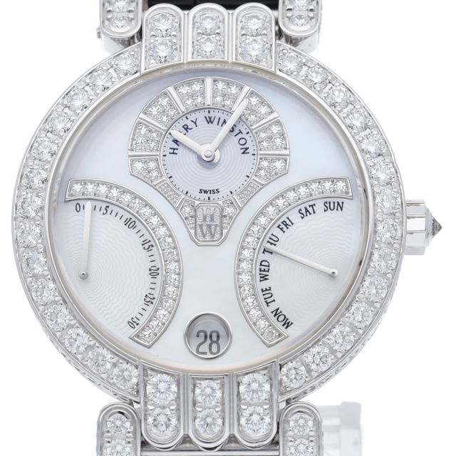 宝飾業界で世界的に有名な「ハリー ウィンストン」。「プルミエールエキセンターバイレトロ」は、ユニークな配列が特徴のレディースモデル。ケースサイドやベゼルやラグ、尾錠に散りばめられたダイヤが一際輝く一本です。200/UABI34WL.MD2/00(PREABI34WW001)。