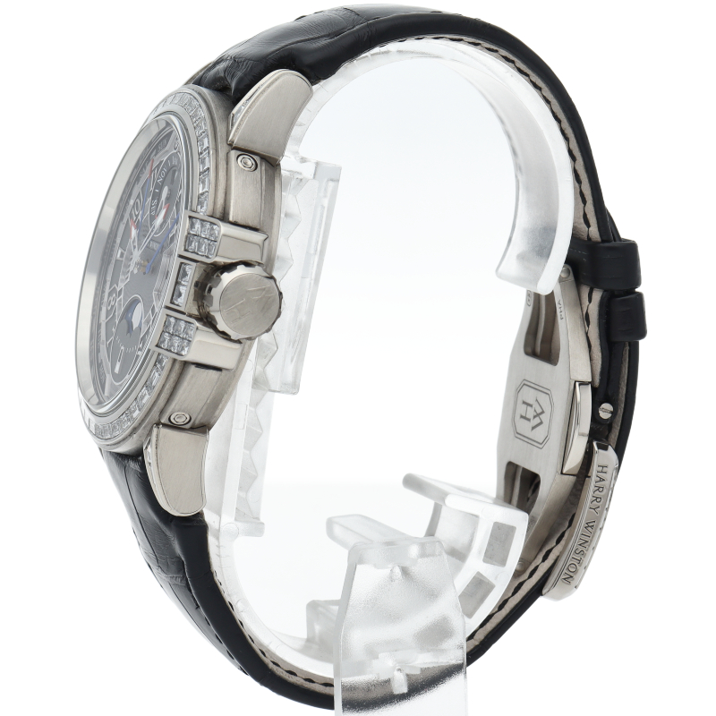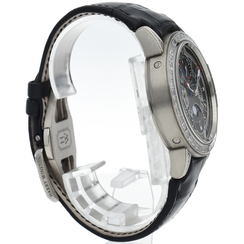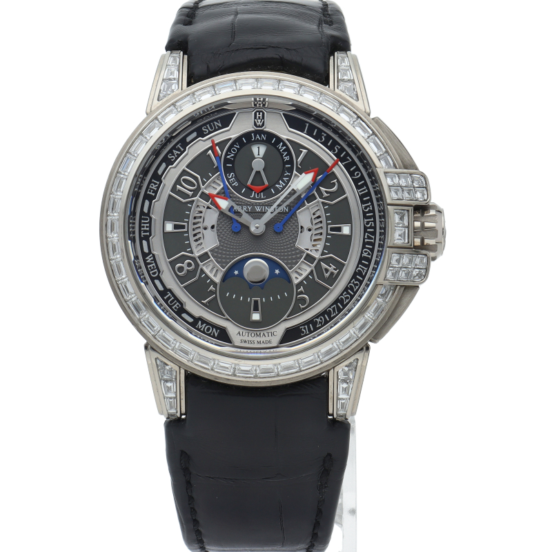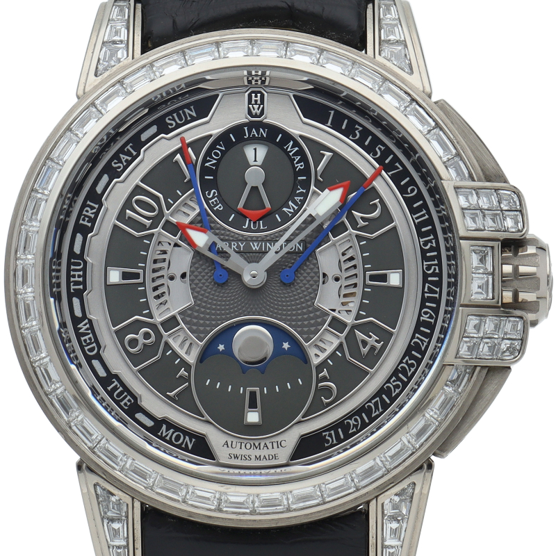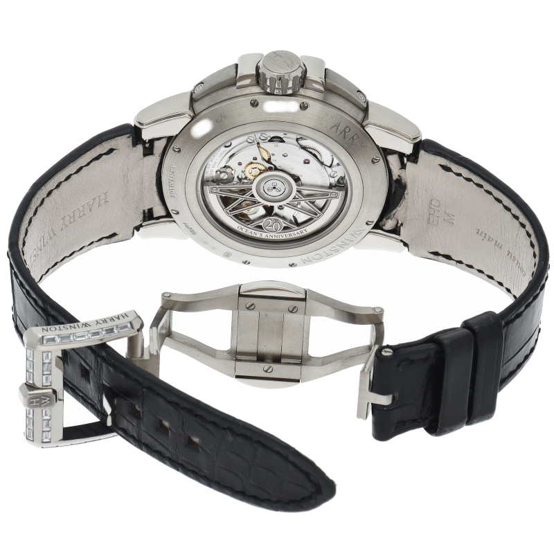 ハリー・ウィンストン「オーシャン バイレトログラード パーペチュアルカレンダー」(OCEAPC42WW002)。誕生20周年を祝う世界限定20本の希少モデルです。42mmのWGケースに輝くバゲットダイヤと、レトログラード式永久カレンダーが融合。究極の高級感と複雑機構が至高の存在感を放つ珠玉の一本です。