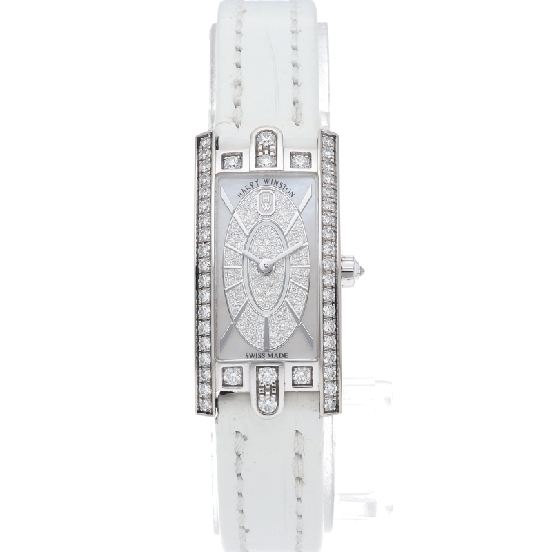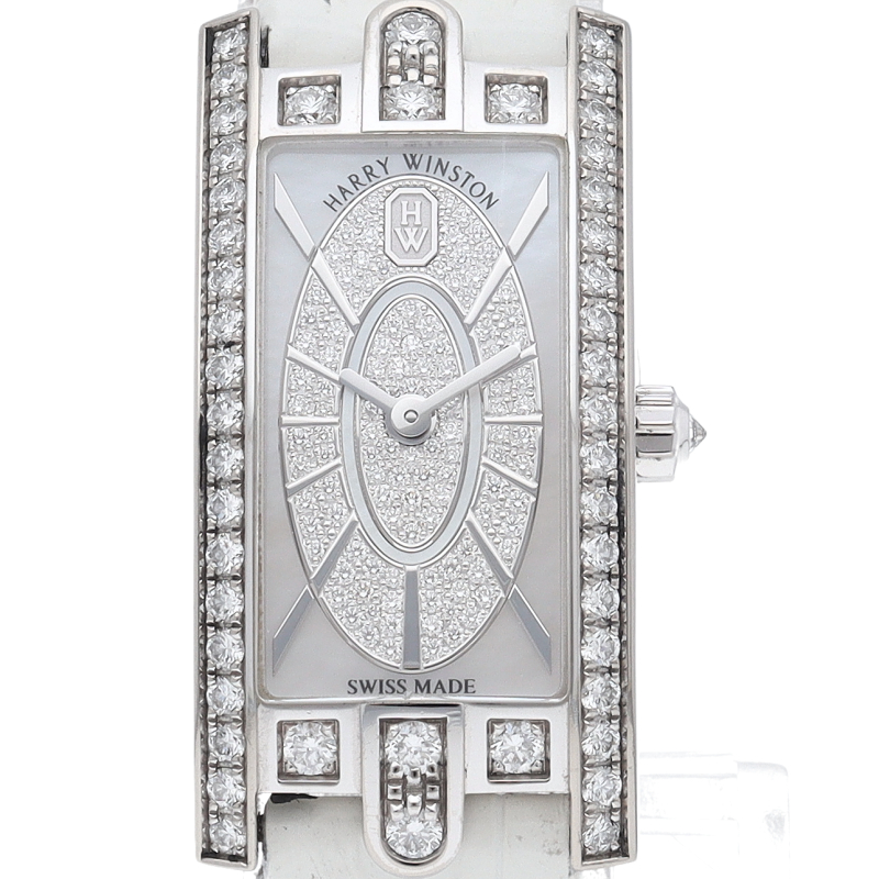 宝飾業界で世界的に有名な「ハリー ウィンストン」。芸術的なデザインと高級感溢れる人気のモデルで、ベゼルとダイヤルに施されたダイヤベゼルとホワイトゴールドの組み合わせが上品な1本。