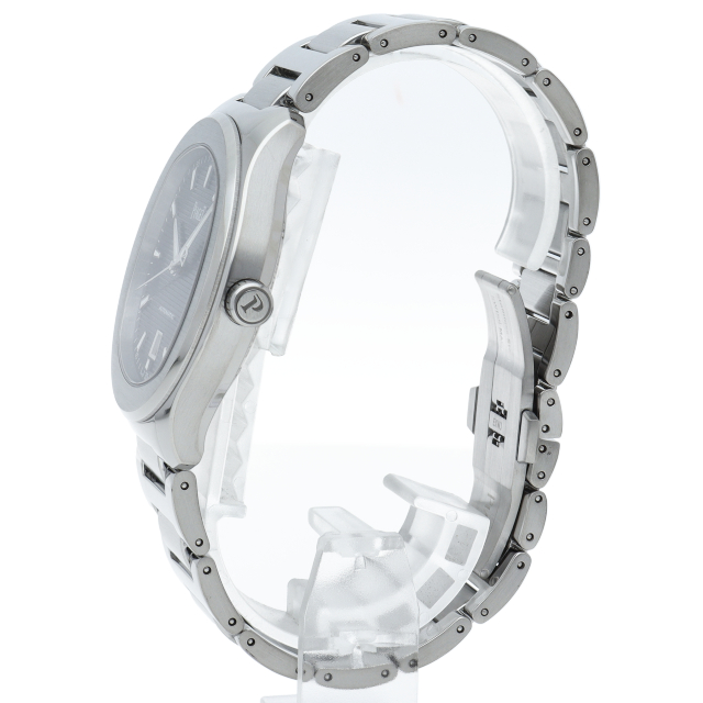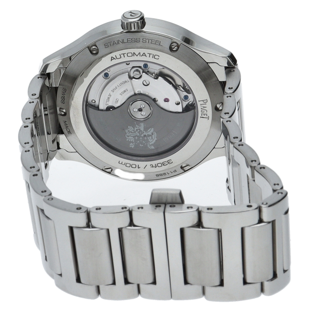 直径42mmのステンレススチール製ケースには、洗練されたポリッシュ仕上げとサテン仕上げが交互に配されています。サファイアケースバックからは、ピアジェの紋章が刻印されたチャコールグレーのローターの繊細な仕上げを見ることができます。細部まで美しい秒針には、スイスのマニュファクチュールの象徴として、透かし模様のPがあしらわれ、どんなシーンにもふさわしく、カジュアルでエレガンスな一本です。G0A41002(P11268)。
