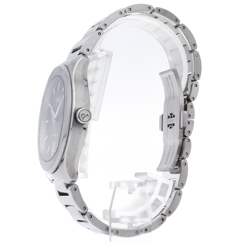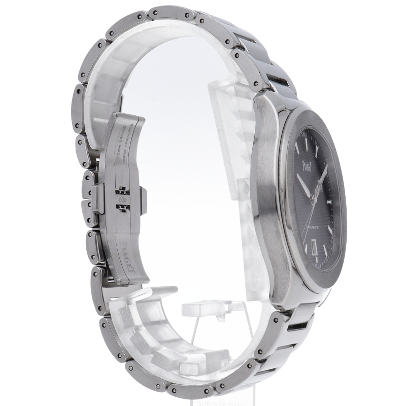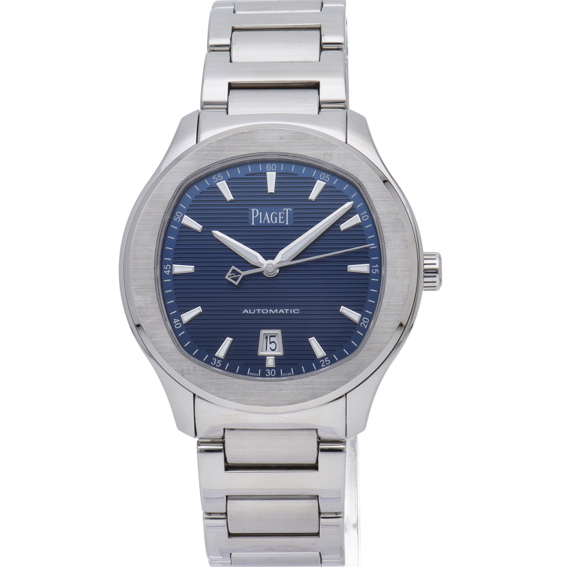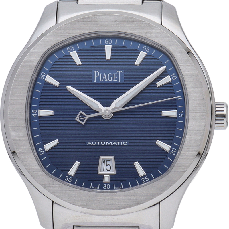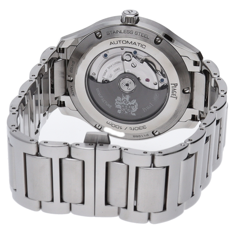 直径42mmのステンレススチール製ケースには、洗練されたポリッシュ仕上げとサテン仕上げが交互に配されています。サファイアケースバックからは、ピアジェの紋章が刻印されたチャコールグレーのローターの繊細な仕上げを見ることができます。細部まで美しい秒針には、スイスのマニュファクチュールの象徴として、透かし模様のPがあしらわれ、どんなシーンにもふさわしく、カジュアルでエレガンスな一本です。G0A41002(P11268)。