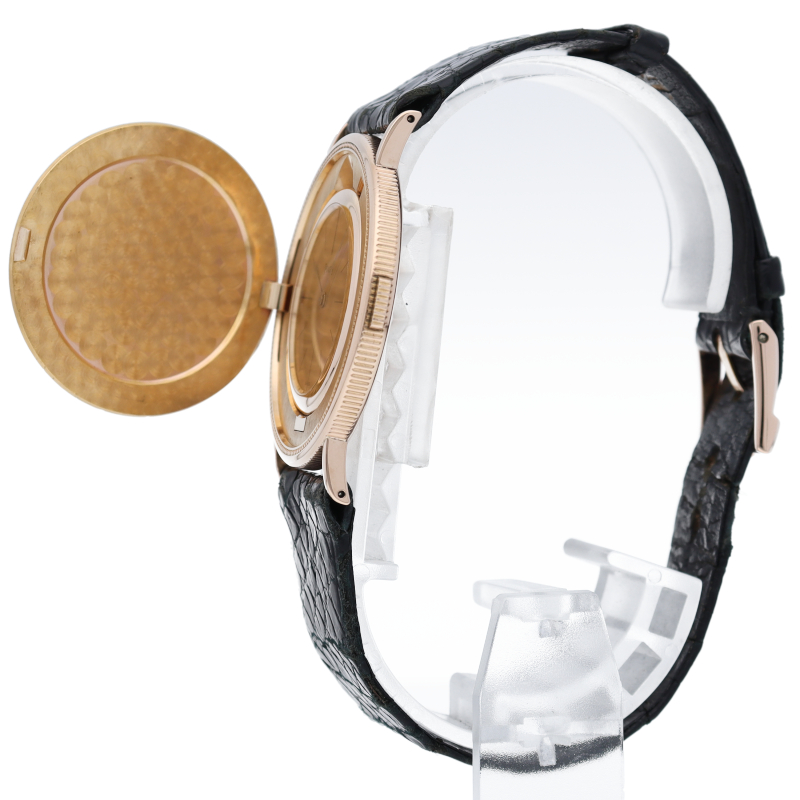 ケースのコインの部分がポリッシュが掛かっており、表面が鏡面っぽい感じになっております。K18PG製尾錠。