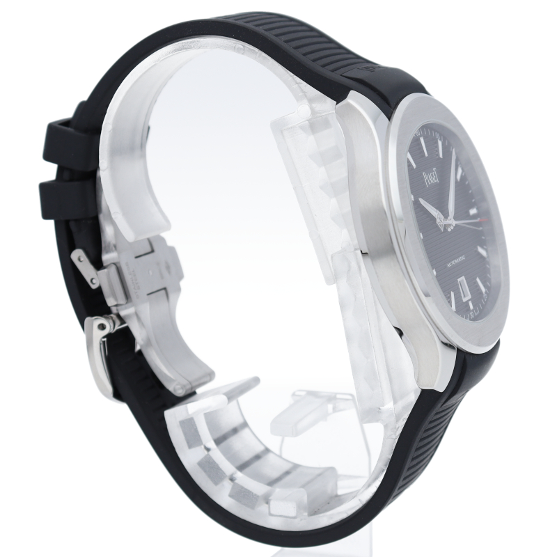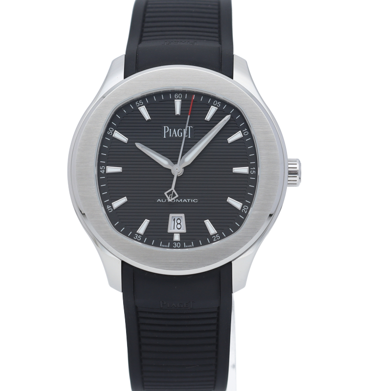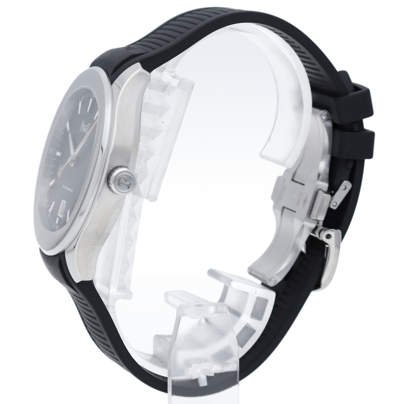 直径42mmのステンレススチール製ケースには、洗練されたポリッシュ仕上げとサテン仕上げが交互に配されています。サファイアケースバックからは、ピアジェの紋章が刻印されたチャコールグレーのローターの繊細な仕上げを見ることができます。細部まで美しい秒針には、スイスのマニュファクチュールの象徴として、透かし模様のPがあしらわれ、どんなシーンにもふさわしく、カジュアルでエレガンスな一本です。G0A47014/P11268