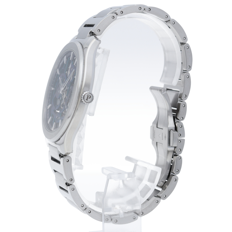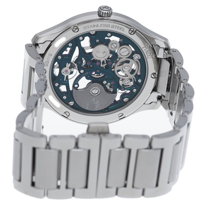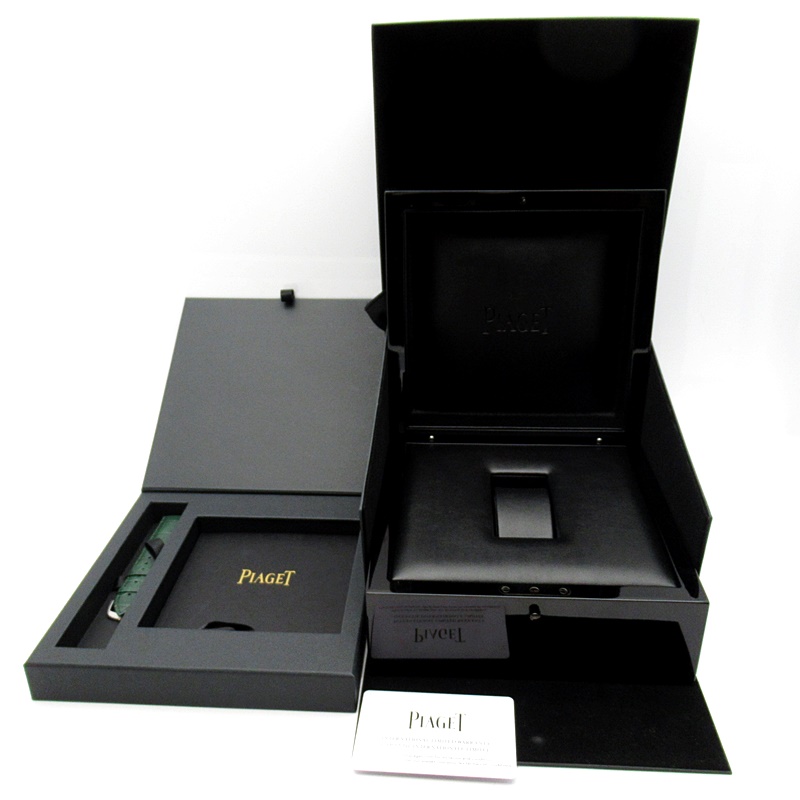 42mmのステンレススチール製ケースには、洗練されたポリッシュとサテン仕上げが交互に配されております。サファイアケースバックからは、ピアジェの紋章が刻印されたチャコールグレーのローターの繊細な仕上げを見ることができます。細部まで美しい秒針には、スイスのマニュファクチュールの象徴として、透かし模様のPがあしらわれ、どんなシーンにもふさわしく、カジュアルでエレガンスな一本です。P11606/G0A47008