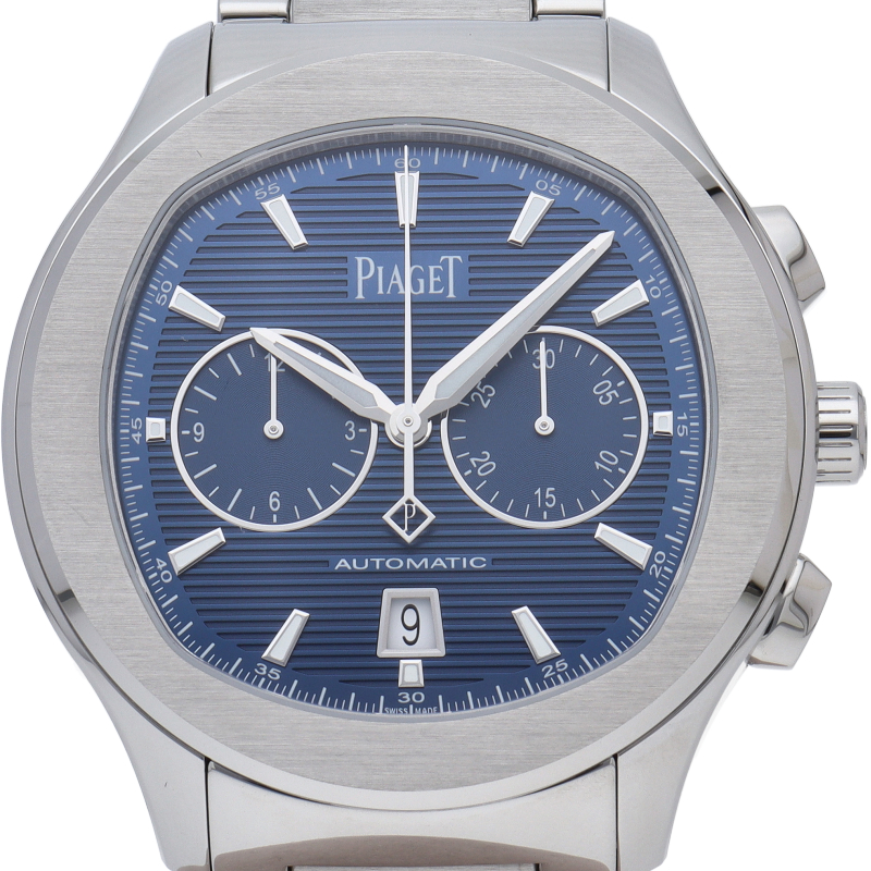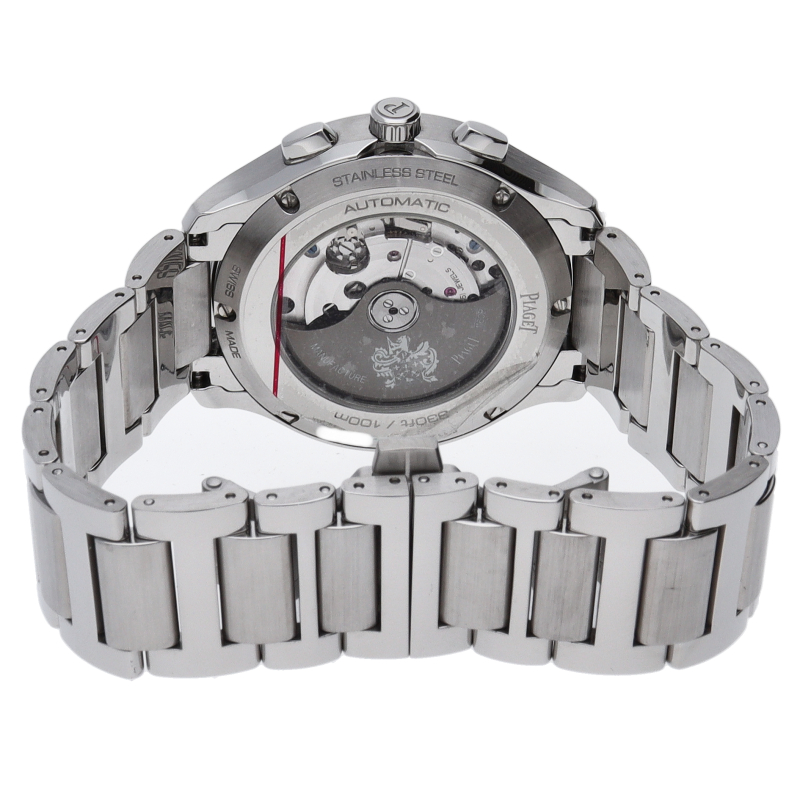 直径42mmのステンレススチール製ケースには、洗練されたポリッシュ仕上げとサテン仕上げが交互に配されています。サファイアケースバックからは、ピアジェの紋章が刻印されたチャコールグレーのローターの繊細な仕上げを見ることができます。細部まで美しい秒針には、スイスのマニュファクチュールの象徴として、透かし模様のPがあしらわれ、どんなシーンにもふさわしく、カジュアルでエレガンスな一本です。