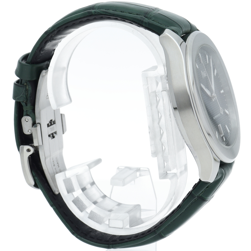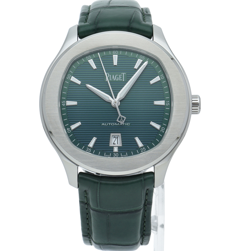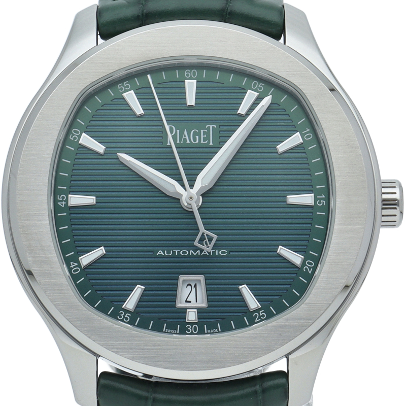 男性向けステンレススチール製自動巻ウォッチ。グリーン文字盤。グリーンアリゲーターストラップ。カジュアルなエレガンスとモダニティを放つこのステンレススチール製ウォッチは、フレッシュなカラーでスポーティーなルックを一層引き立てます。ピアジェならではのラウンド型とクッション型を融合させた直径42mmのケースに、ギョーシェ模様のグリーン文字盤が無数のシェードを煌めかせます。