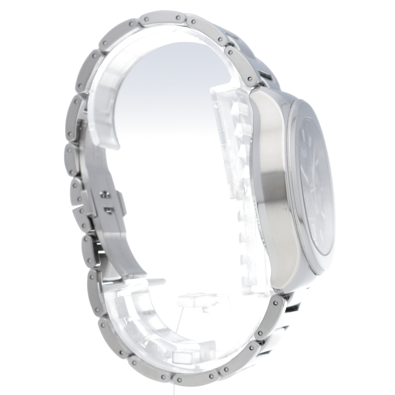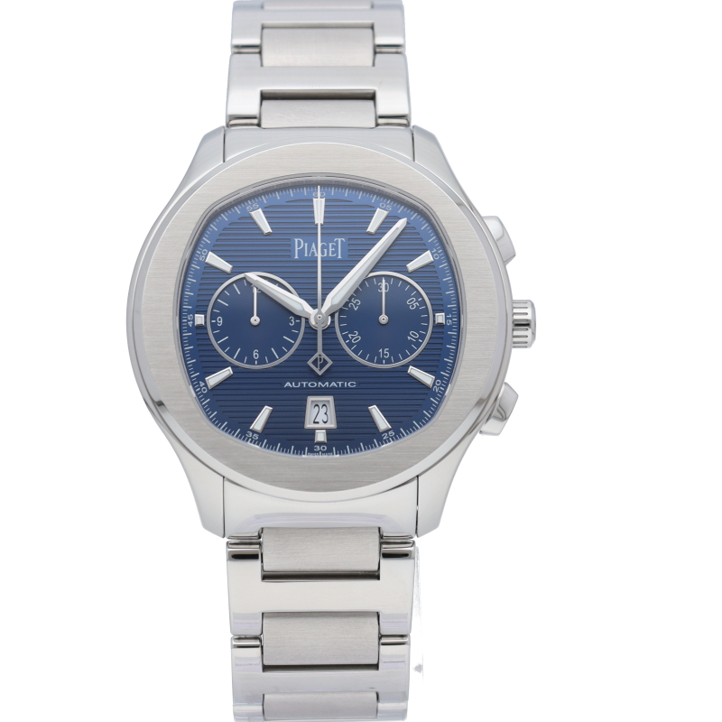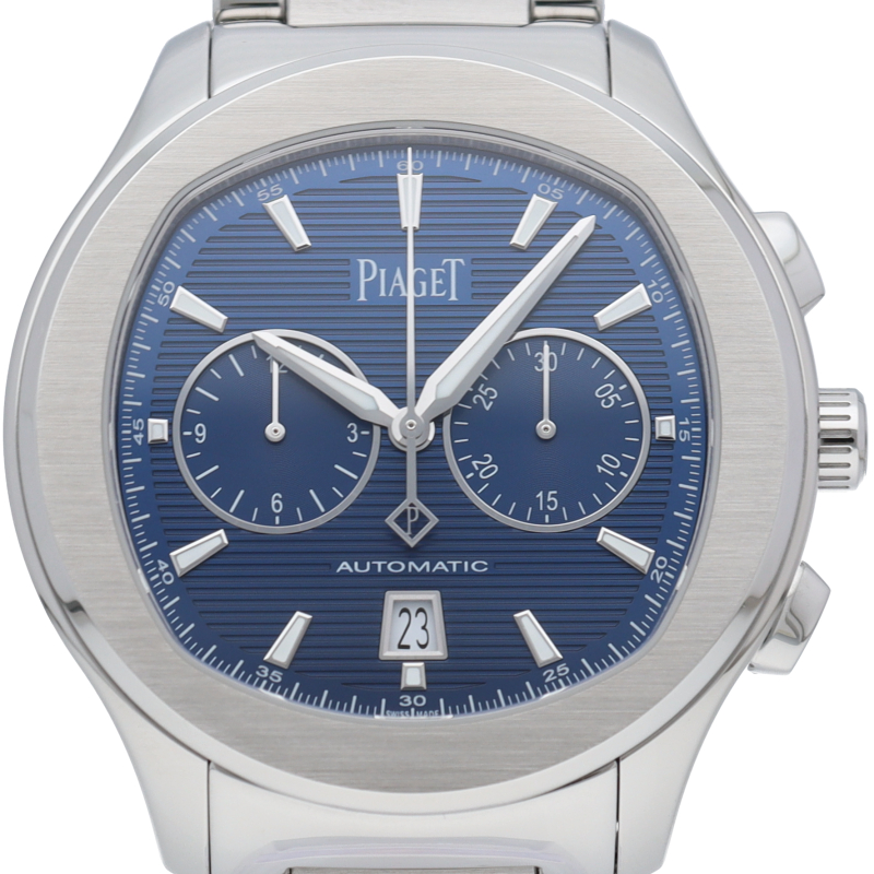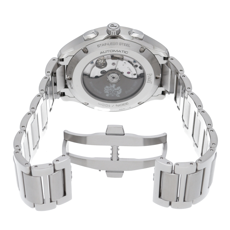 直径42mmのステンレススチール製ケースには、洗練されたポリッシュ仕上げとサテン仕上げが交互に配されています。サファイアケースバックからは、ピアジェの紋章が刻印されたチャコールグレーのローターの繊細な仕上げを見ることができます。細部まで美しい秒針には、スイスのマニュファクチュールの象徴として、透かし模様のPがあしらわれ、どんなシーンにもふさわしく、カジュアルでエレガンスな一本です。