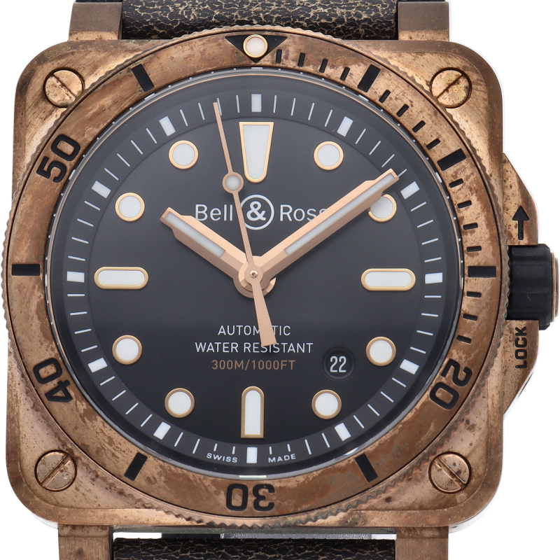 2017年に発表されたBR03では初となるダイバーモデルの「BR03-92ダイバー」。使い込む程に経年劣化を楽しむ事が出来るブロンズケースが2022年に追加されました。世界限定999本のケースバックにこの時計の象徴である、深海を潜るための潜水ヘルメットが刻印されています。