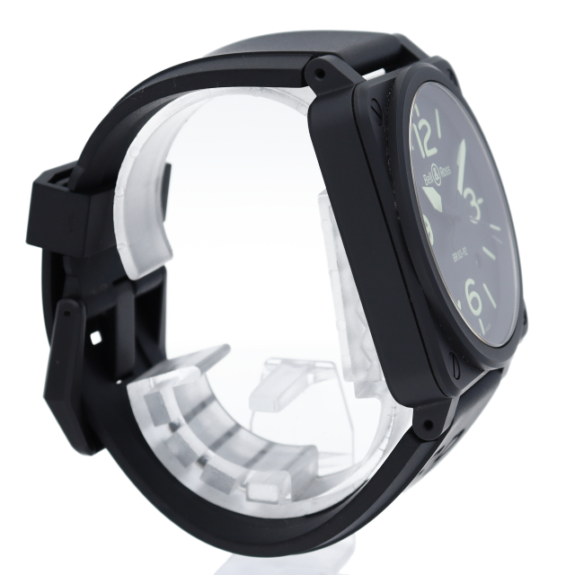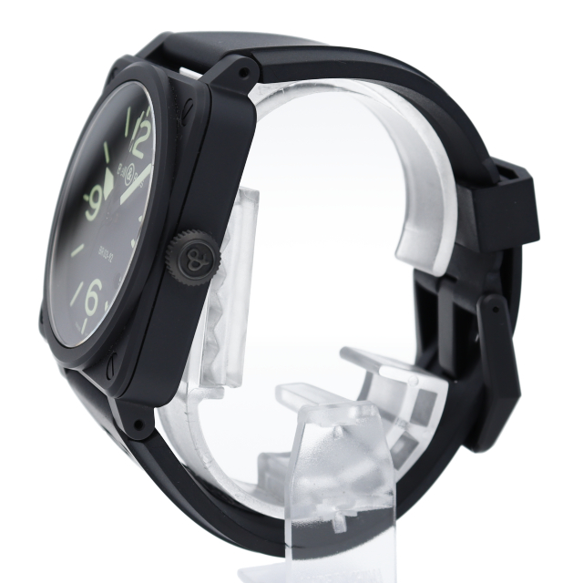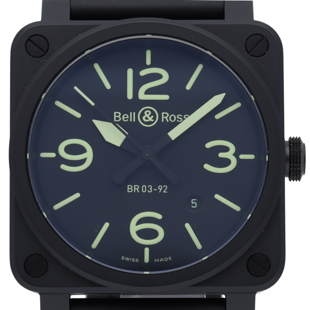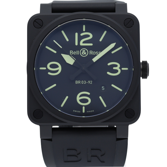 斬新な角形ケースが印象的なコレクション「BR03」。航空機のコックピットクロックから発想を得たこの時計は、視認性を重視した機能的な道具という面が一段と強調されています。