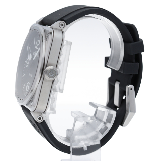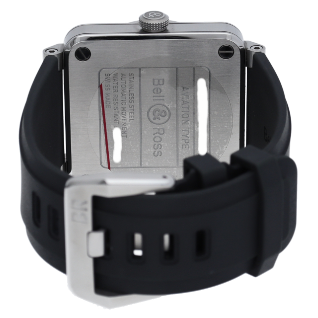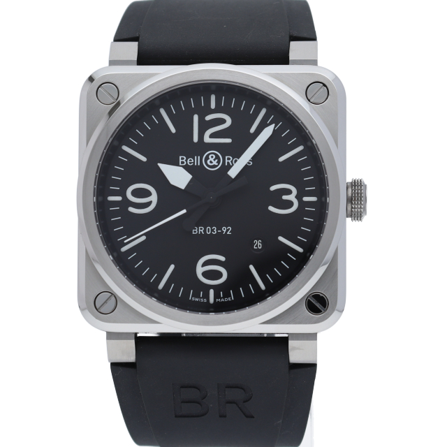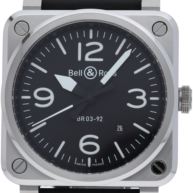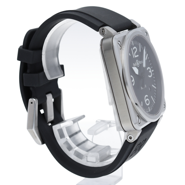 斬新な角形ケースが印象的なコレクション「BR03」。航空機のコックピットクロックから発想を得たこの時計は、視認性を重視した機能的な道具という面が一段と強調されています。