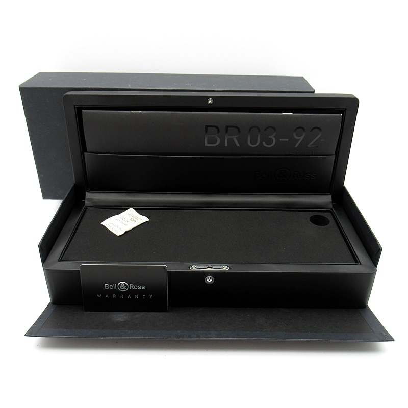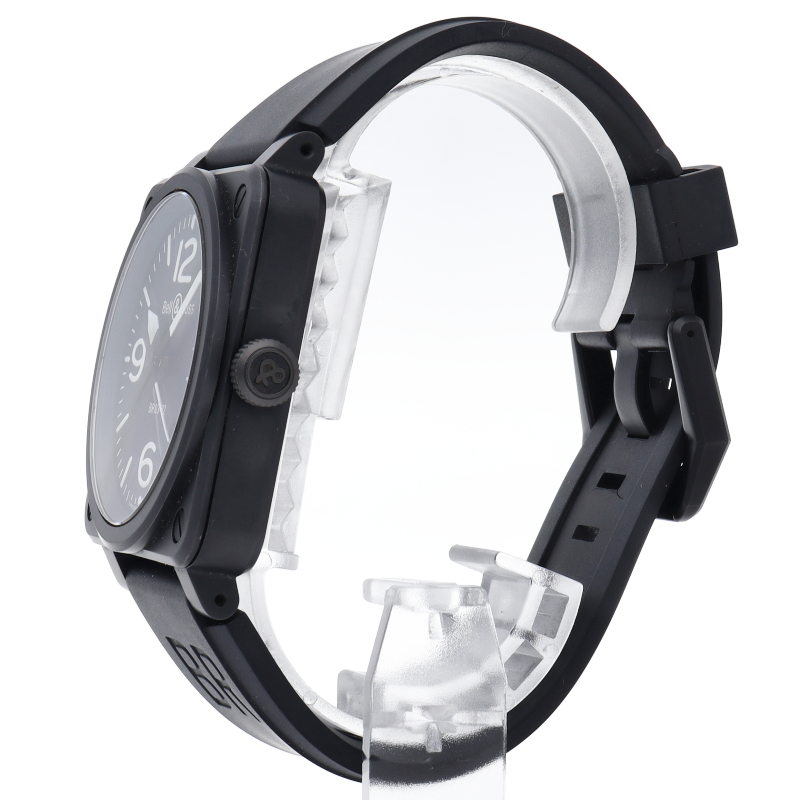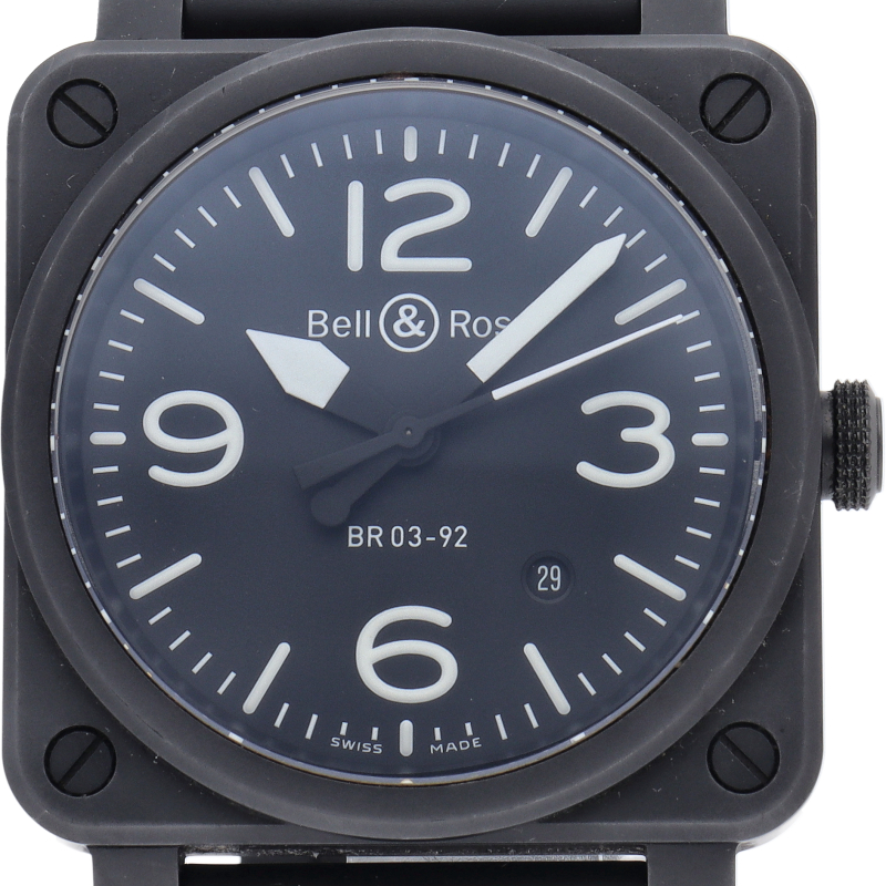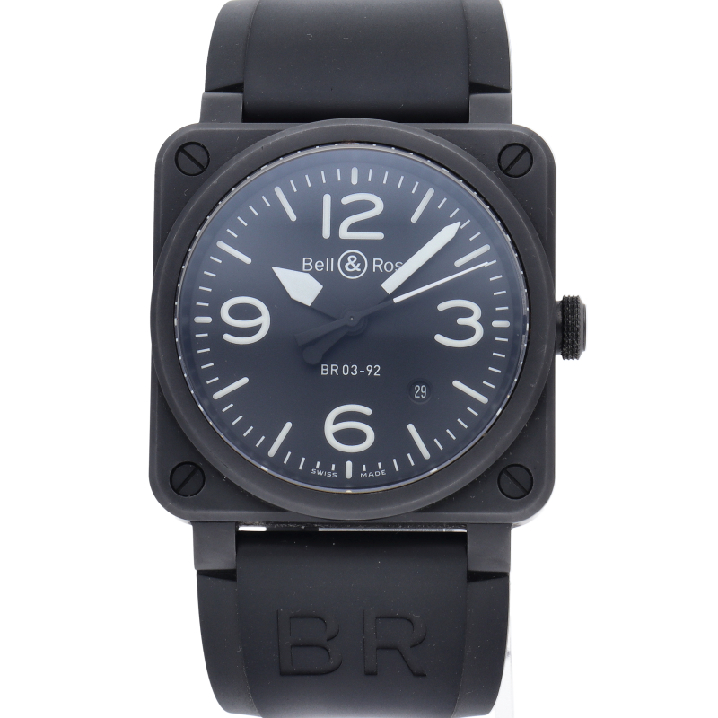 斬新な角形ケースが印象的なコレクション「BR03」。航空機のコックピットクロックから発想を得たこの時計は、視認性を重視した機能的な道具という面が一段と強調されています。