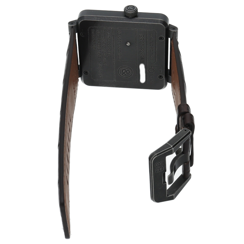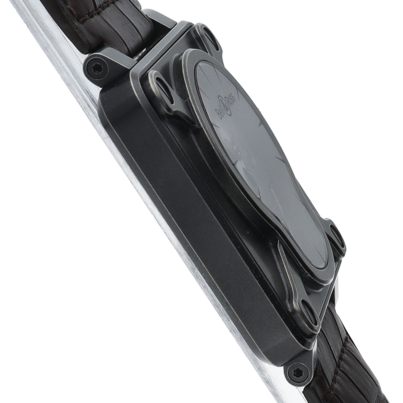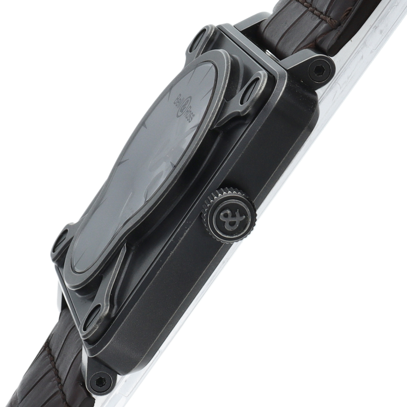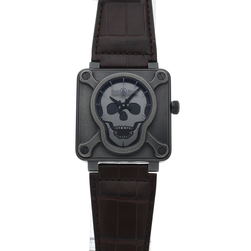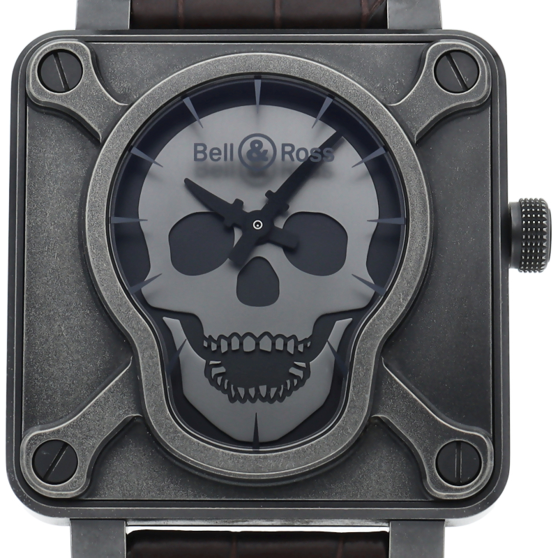 航空計器をイメージした独特なスクエアケースが特徴的な「BR01シリーズ」。シンプルなデザインかつ視認性も優れた1本。ブラックカーボンでパウダーコーティングされたケースにスカルモチーフの世界999本限定の希少モデルです。