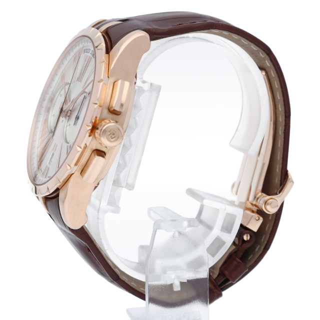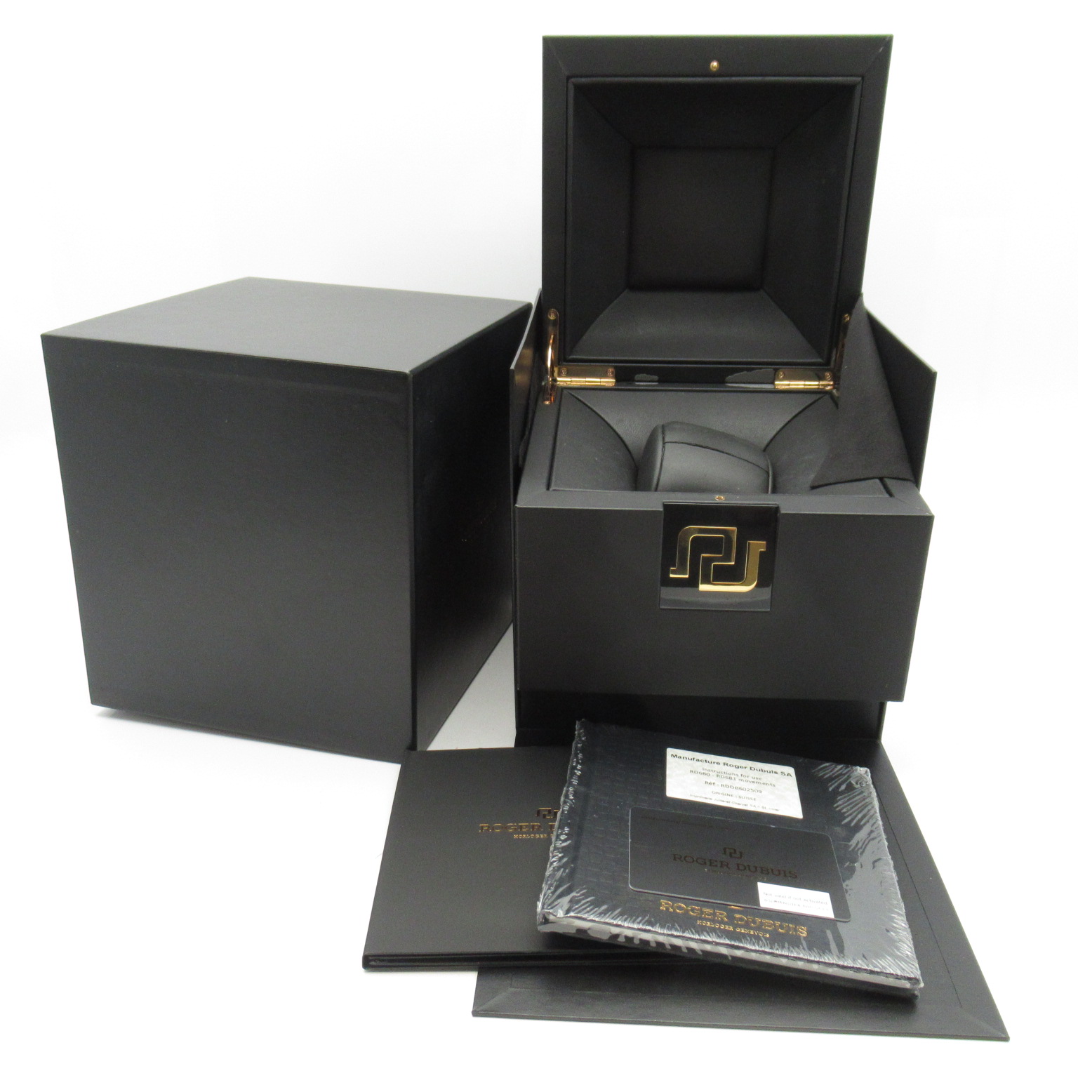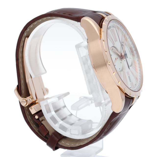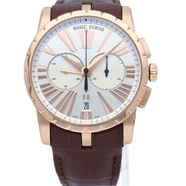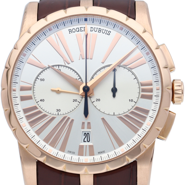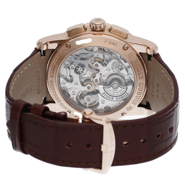 高級スポーツウォッチの人気を牽引するロジェ・デュブイの代表作“エクスカリバー”。こちらは直径42mmのケース径が逞しい“エクスカリバー42”で、ベゼル、インデックスに使用されたK18ローズゴールドが華やかな印象を与えるモデルです。ムーブメントにはジュネーブシール取得の自動巻き・RD681を搭載。3気圧防水。裏蓋からは丁寧な仕上げとテンプの動き、そしてマイクロローターをご覧頂けます。