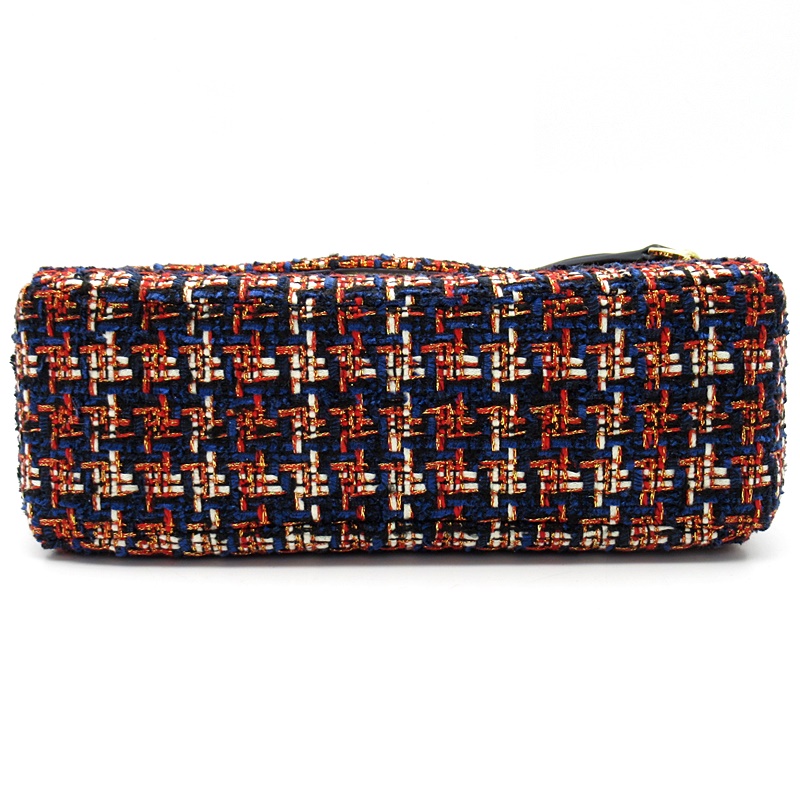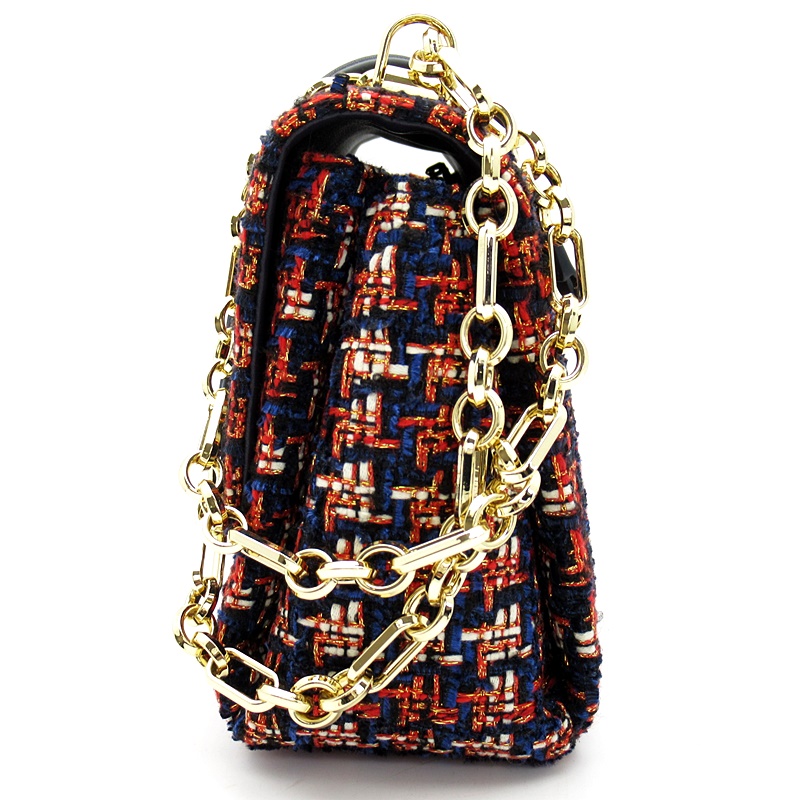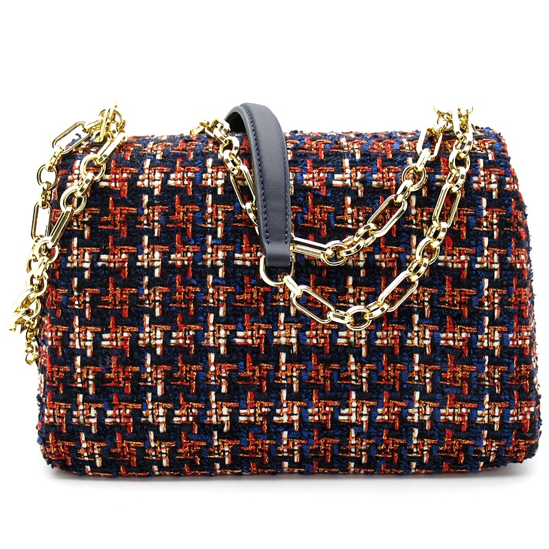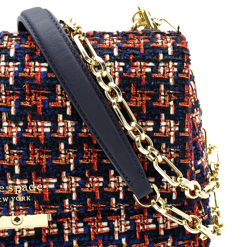 USED品。ネイビーとレッドの色合いがお洒落なチェーンショルダーバッグです。マチもあり、大容量で普段使いにぴったりな品です。