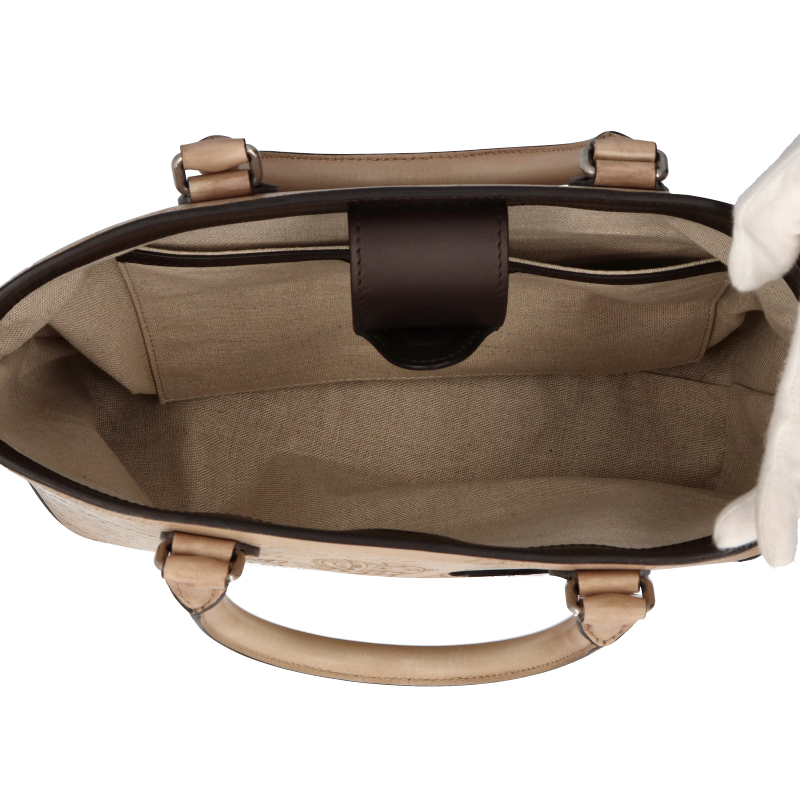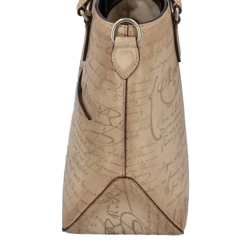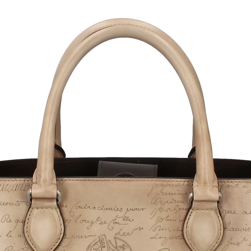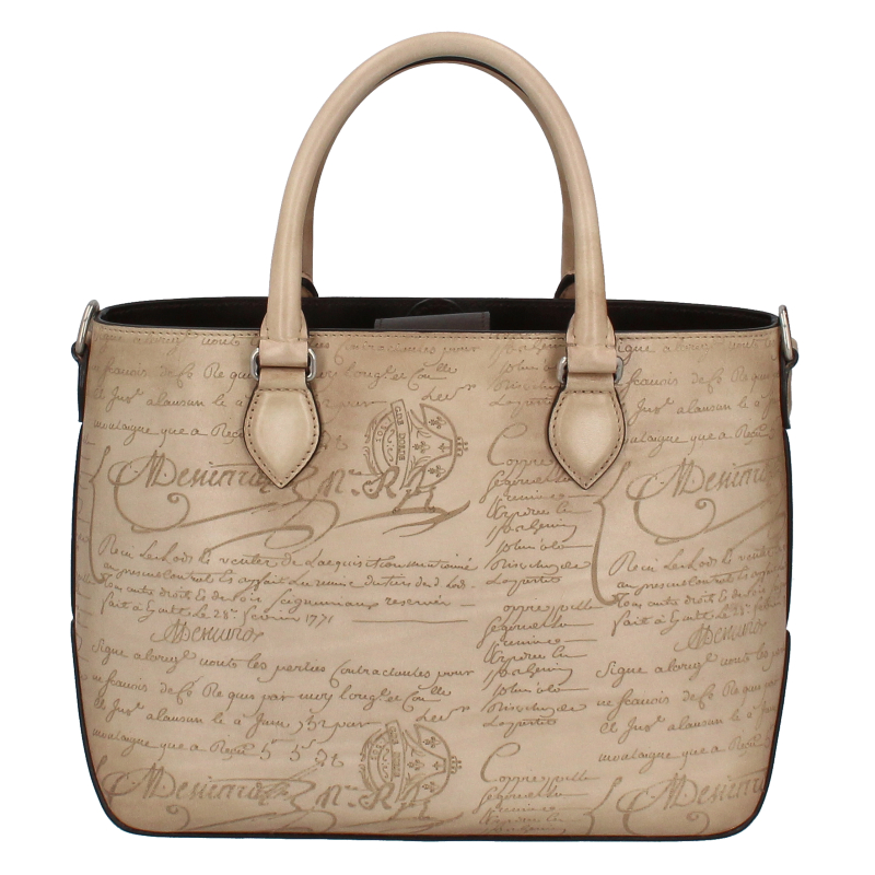 USED品。ヴェネチアレザーを使用した最高級のバッグブランド、ベルルッティ。全面に施された手書きで書かれた様なカリグラフィデザインはベルルッティを代表するデザインです。中身をすぐに取り出すことが可能で、肩に掛けたり手で持つことができます。