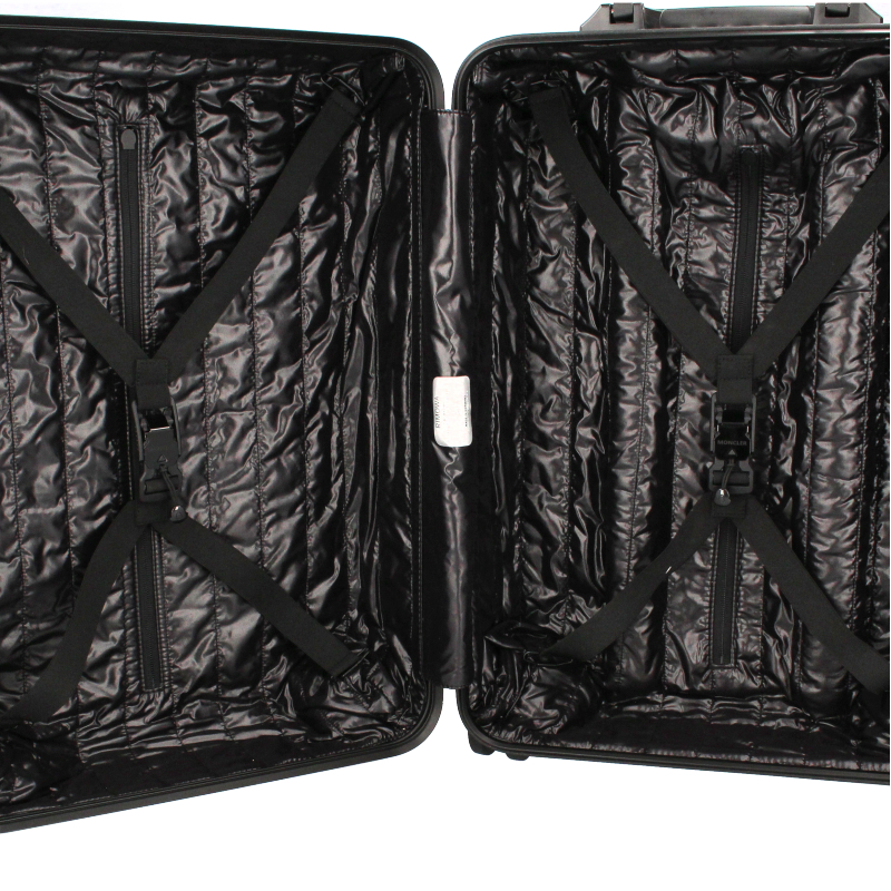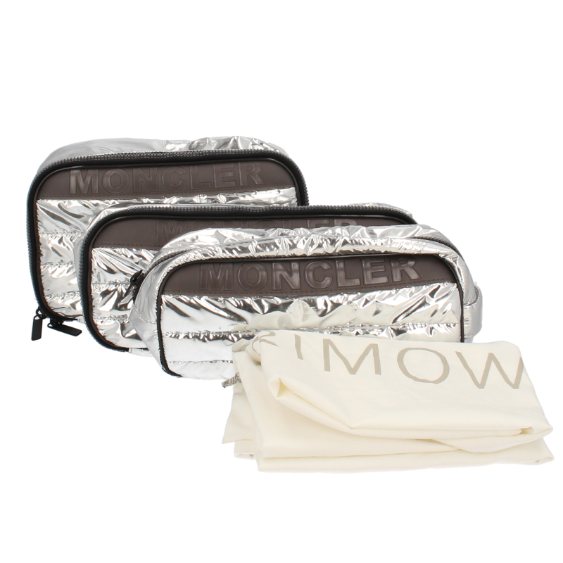 USED品。イタリアのラグジュアリーファッションブランド、モンクレールとのコラボレーションによるスーツケースです。特別な鏡面加工を施した光沢のあるアルミニウムボディに、マットブラックのハンドルとリベットでアクセントを加え、モンクレールのシグネチャーであるパッド入りナイロン生地で内側を仕上げてあります。